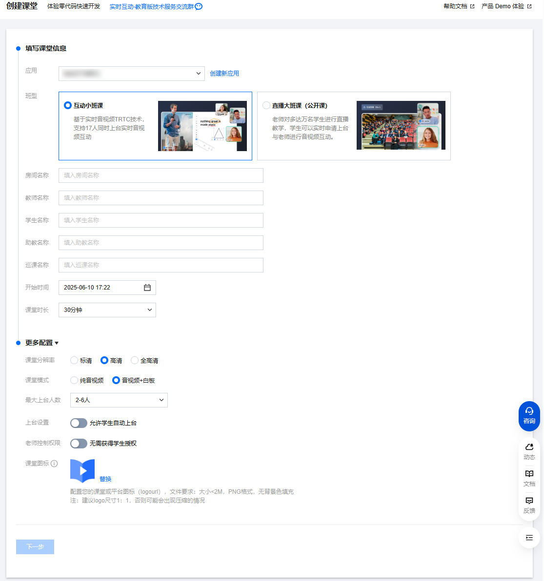 1. 进入 创建课堂 页面,选择已创建的应用,按需选择班型。