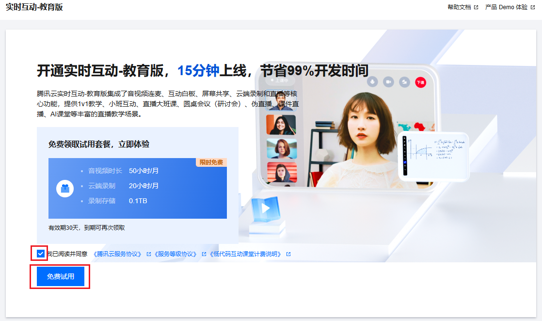 2. 进入 实时互动-教育版控制台,阅读并同意相关协议及计费说明,然后单击开通免费试用。