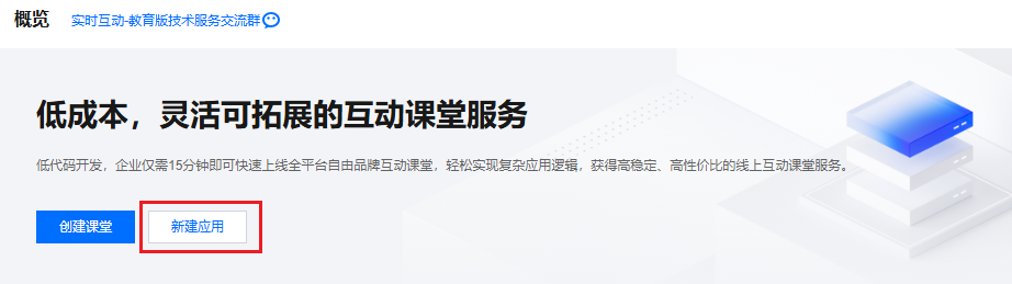 1. 进入 实时互动-教育版控制台 后,在左侧导航栏选择概览页并单击新建应用。