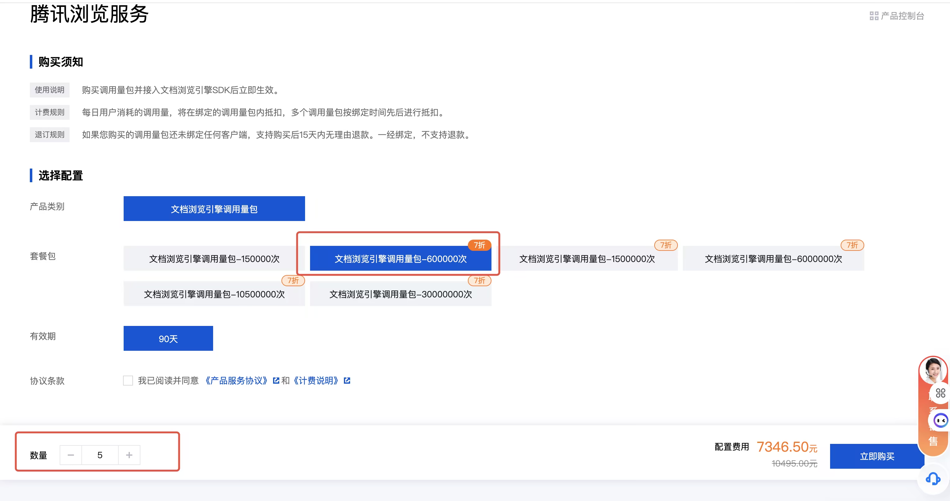 1.请先评估当前业务在90天调用本产品的量级,选择购买对应量级的调用量包4-5个。例如,某产品90天的调用量约为550000次,则可以购买文档引擎调用量包-600000次4个或5个。