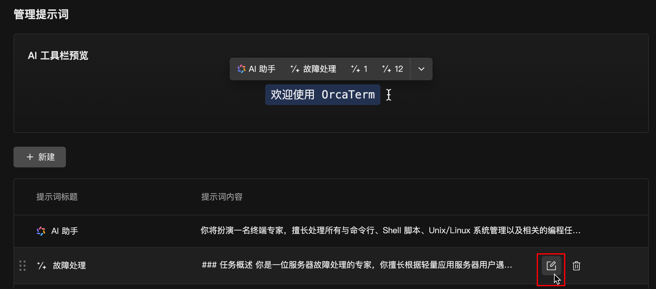 AI 提示词功能下线并不会影响您对 OrcaTerm AI 助手的使用,后续您仍然可以通过将提示词与输入内容同时键入输入框的方式来使用。