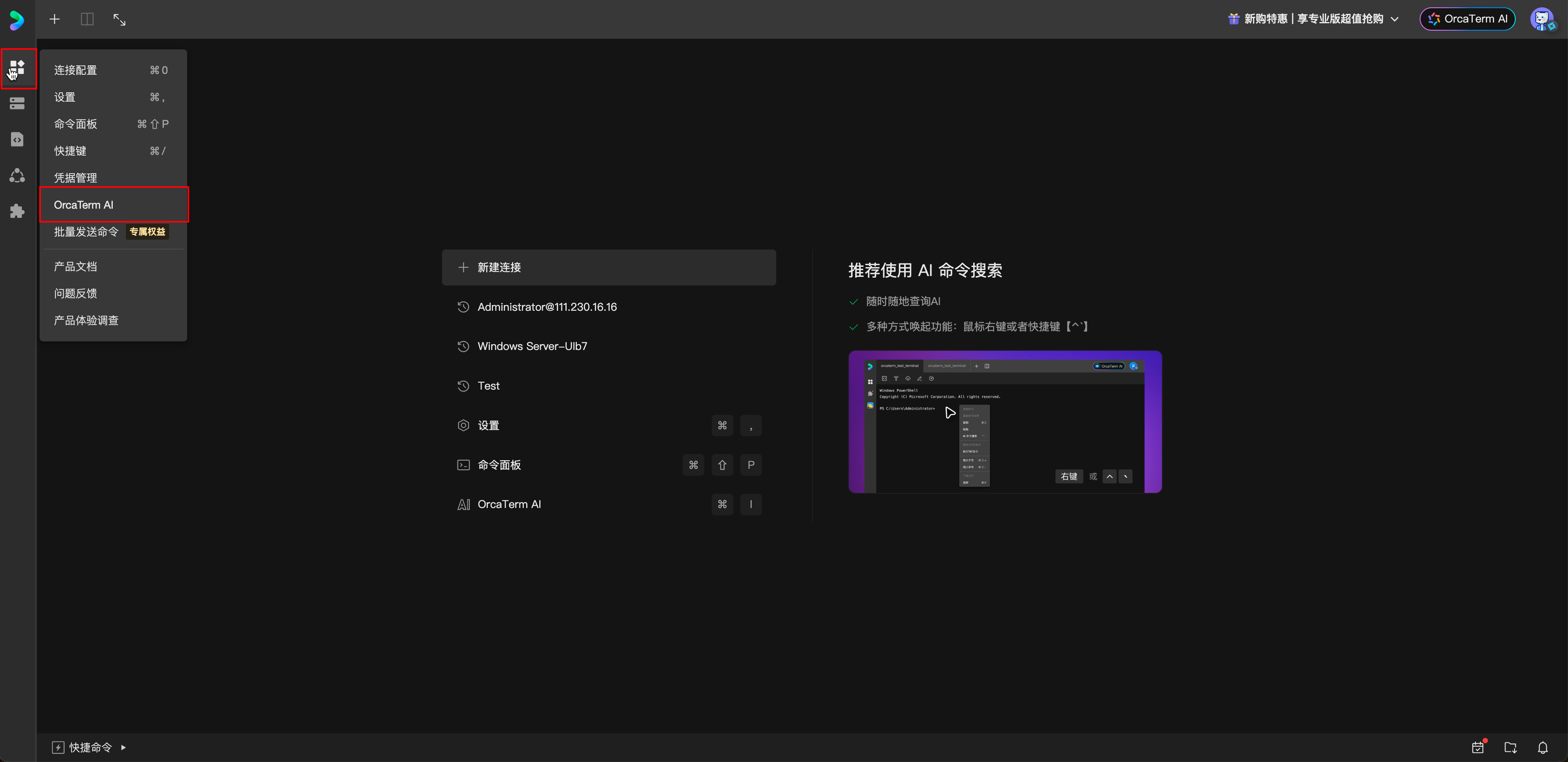 1. 进入 OrcaTerm 控制台,在左上角功能菜单中找到 OrcaTerm AI,单击进入 AI 提示词页面。