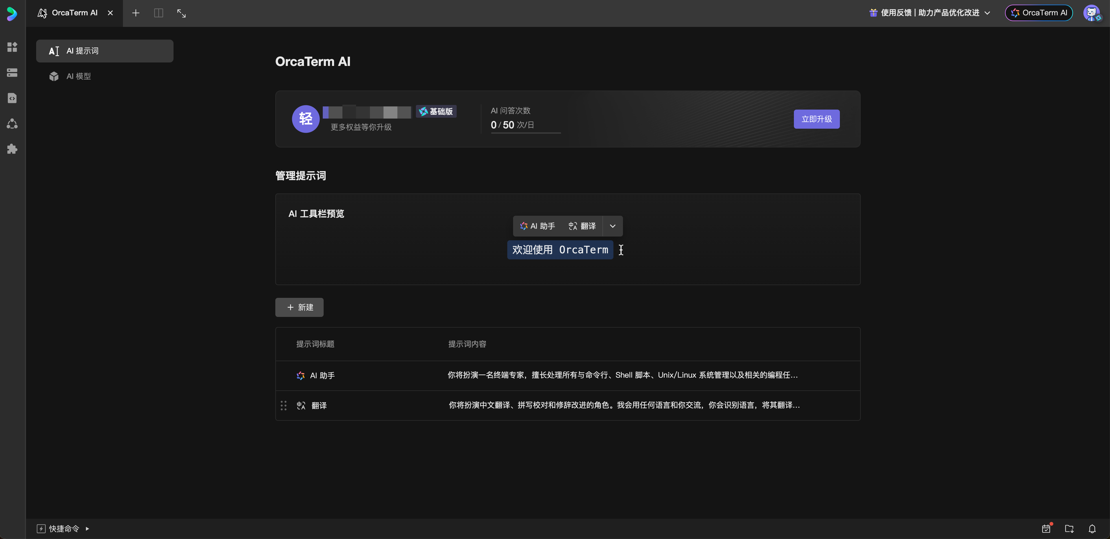 自公告推出之日起,OrcaTerm 将首先停止支持 AI 提示词的新建功能。
