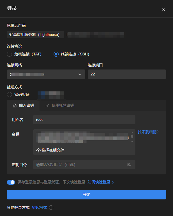 3. 填写服务器用户名、端口以及对应密钥,单击弹窗中的登录按钮即可连接服务器。