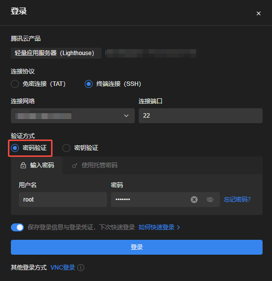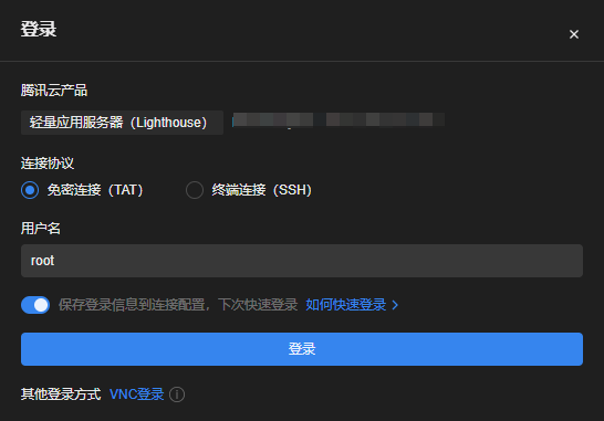 如果是从控制台进入的,页面会弹出登录弹窗,免密登录为默认选中的登录方式,单击登录即可连接服务器。