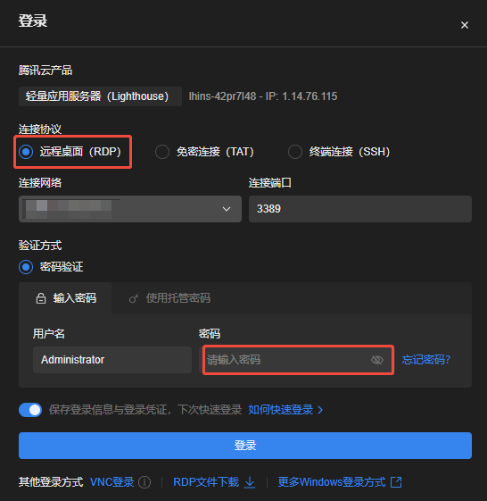 3. 填写服务器登录所需用户名(Windows 服务器默认为 Administrator)、端口以及对应密码或选择凭据后,单击弹窗中的登录即可连接服务器。