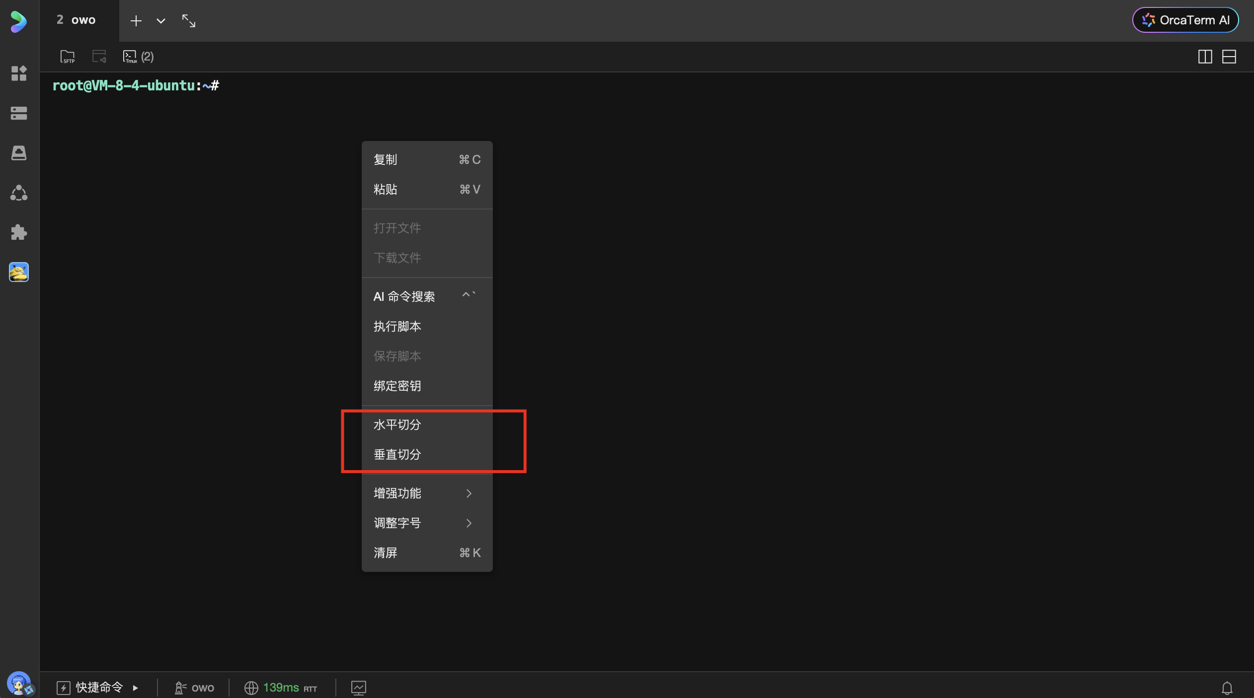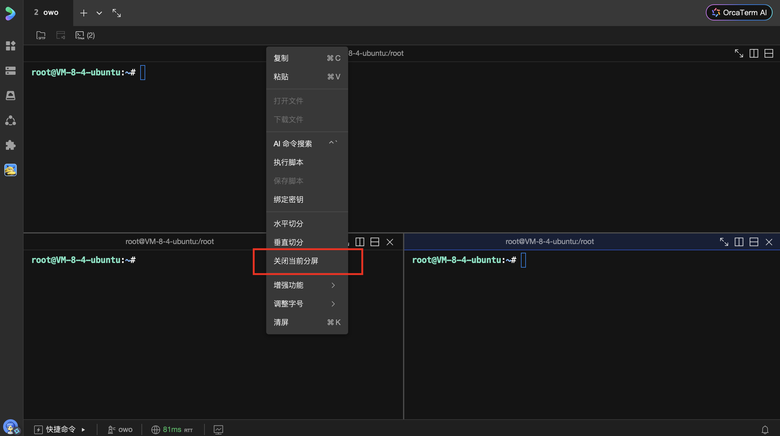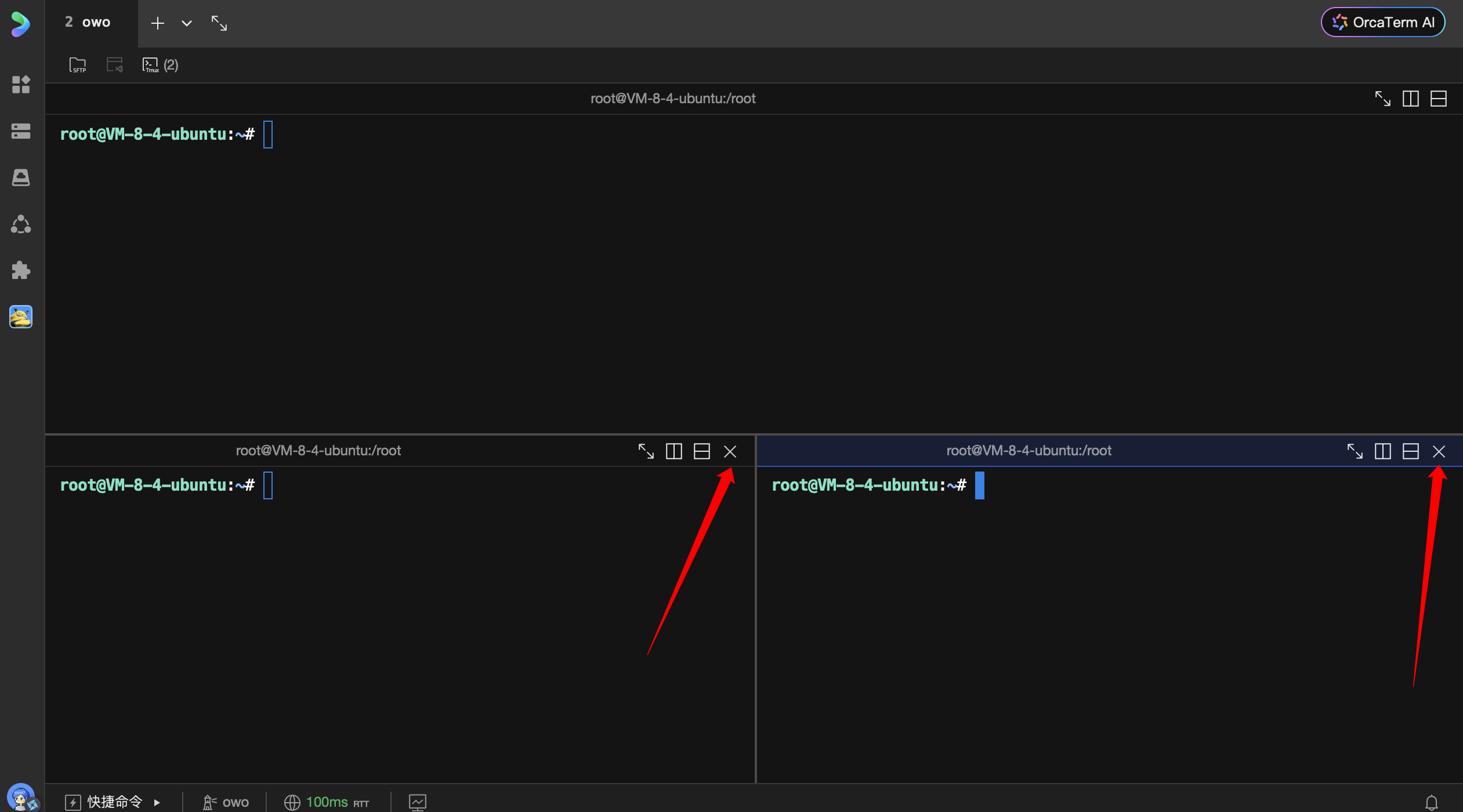 您可以在 OrcaTerm 界面打开多个实例连接窗口,实现分屏操作,便于同时管理多个会话。