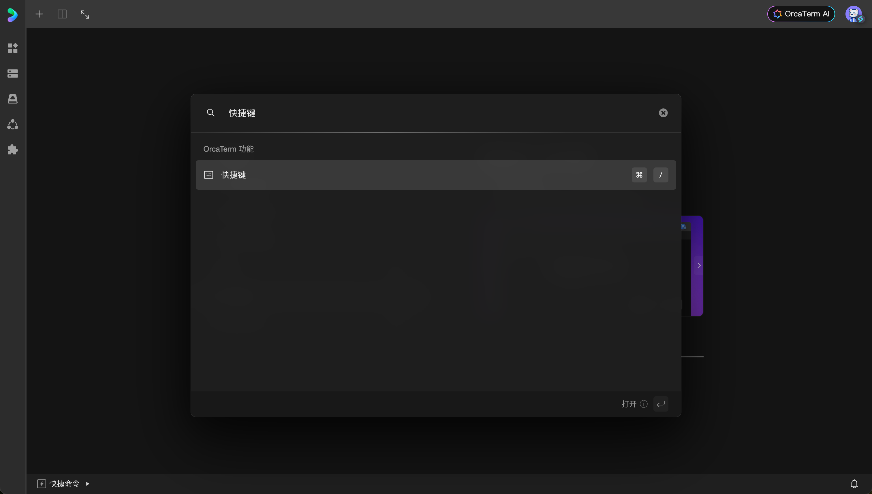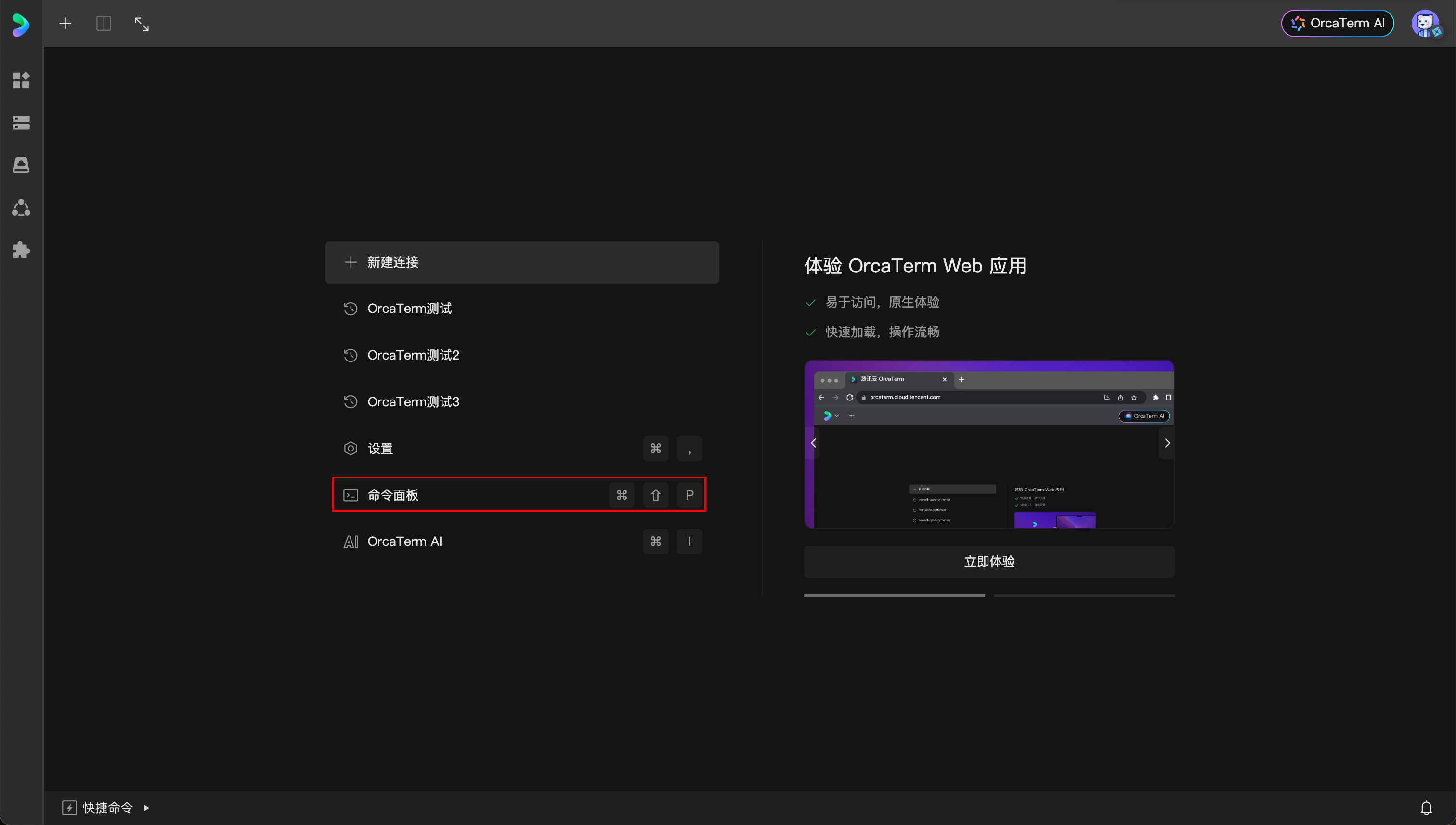 您可以通过 OrcaTerm 首页、 OrcaTerm 左侧功能列表或快捷键唤起命令面板功能。