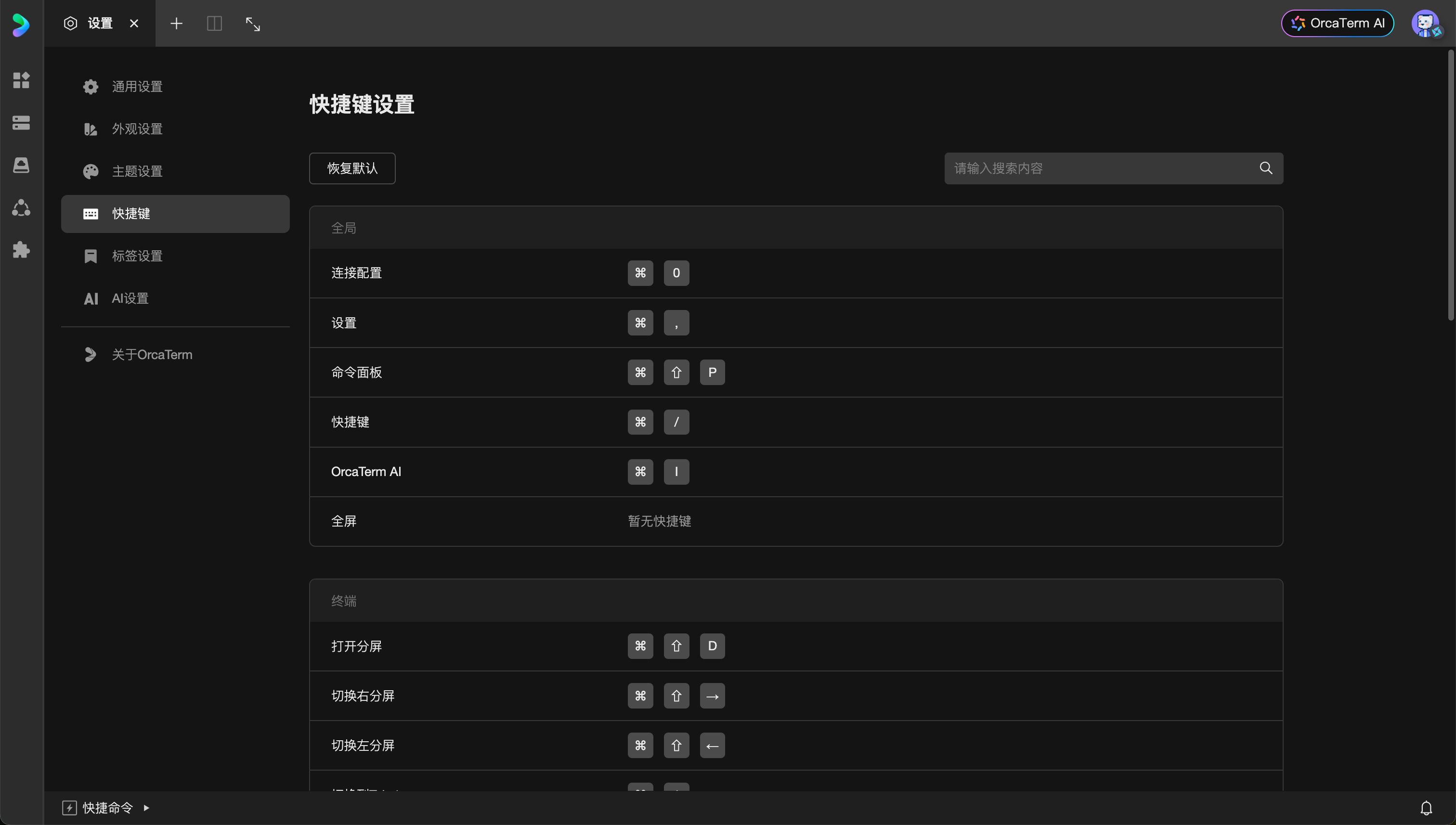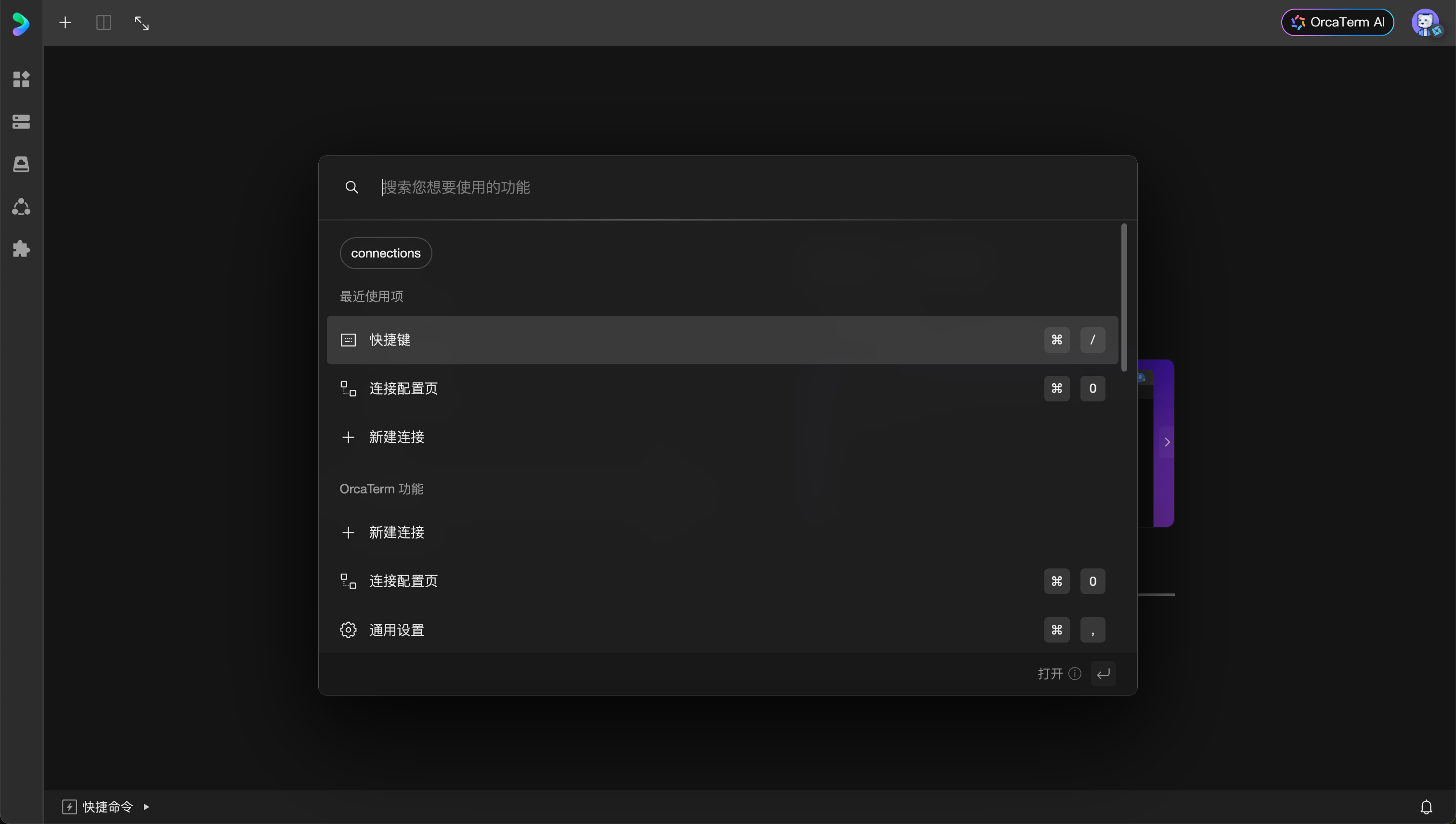 命令面板允许您发现并唤起 OrcaTerm 的常用功能,如连接配置、外观/主题快捷设置、OrcaTerm AI、终端搜索等。