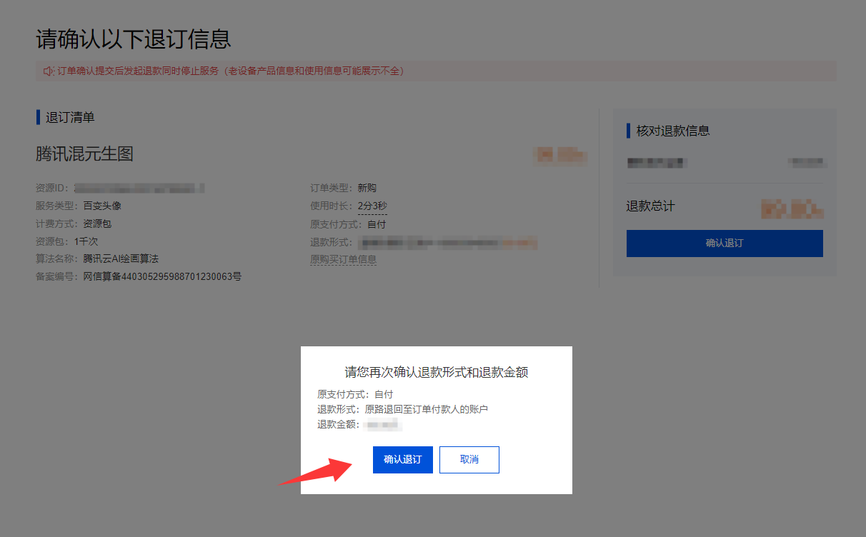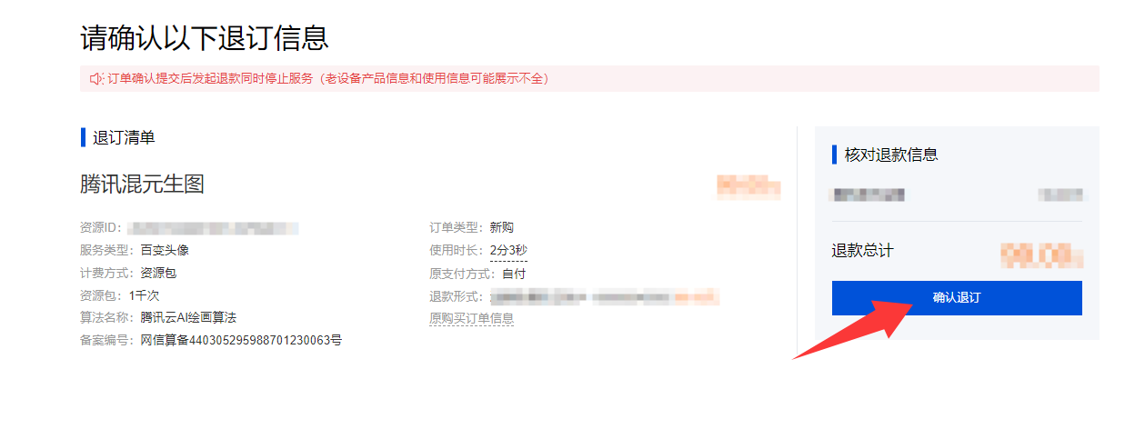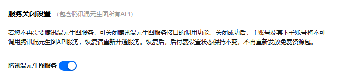 5. 完成退款后,如您需要关闭服务不再使用,可选择在 设置 页面关闭腾讯混元生图服务。关闭服务后,主账号及其下子账号将不可使用腾讯混元生图的任何服务,请谨慎操作。