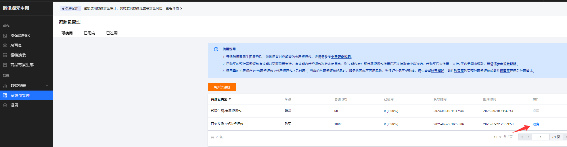 1. 登录腾讯混元生图控制台,进入 资源包管理 页面,选择需要退款的资源包,单击 退费。