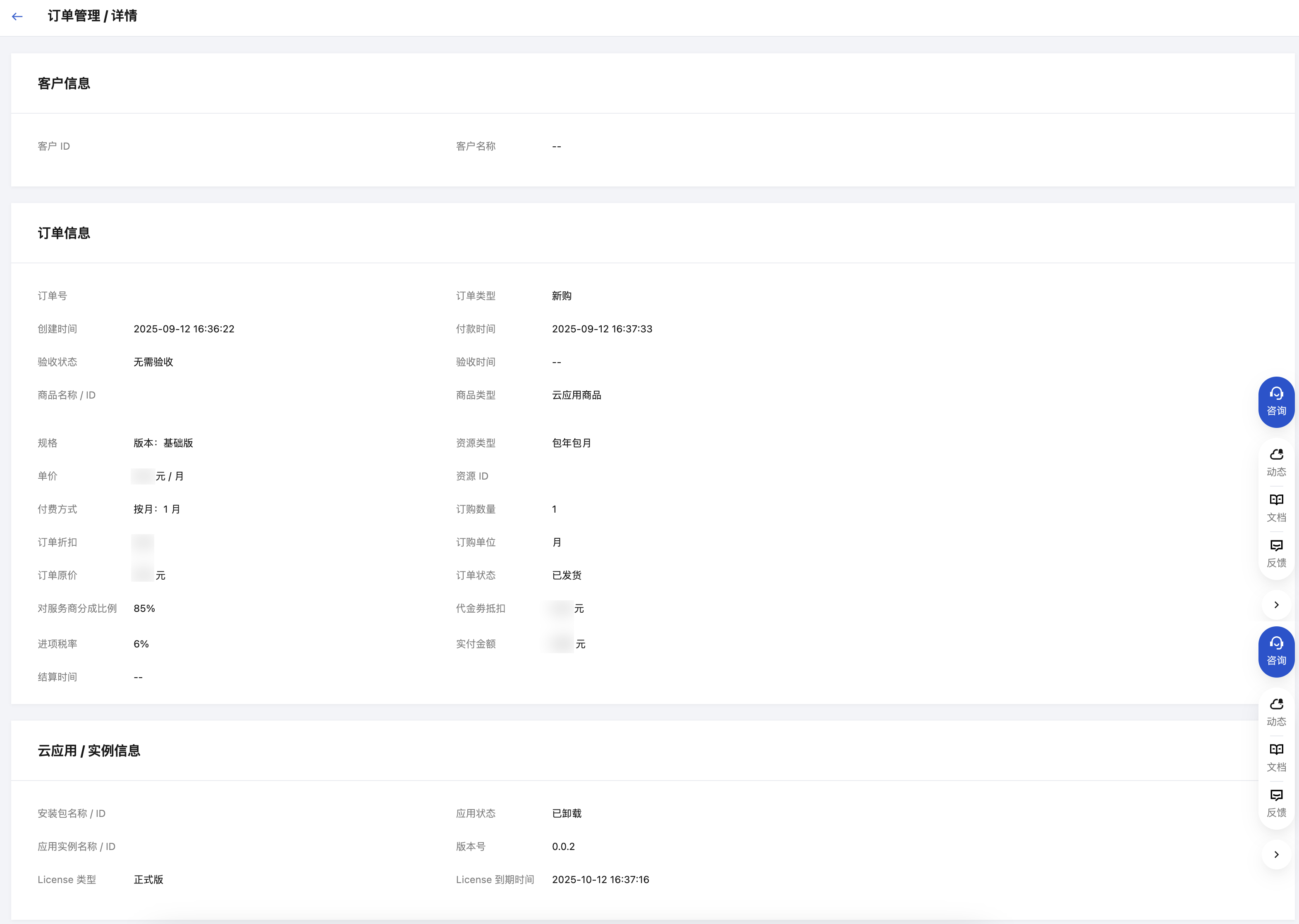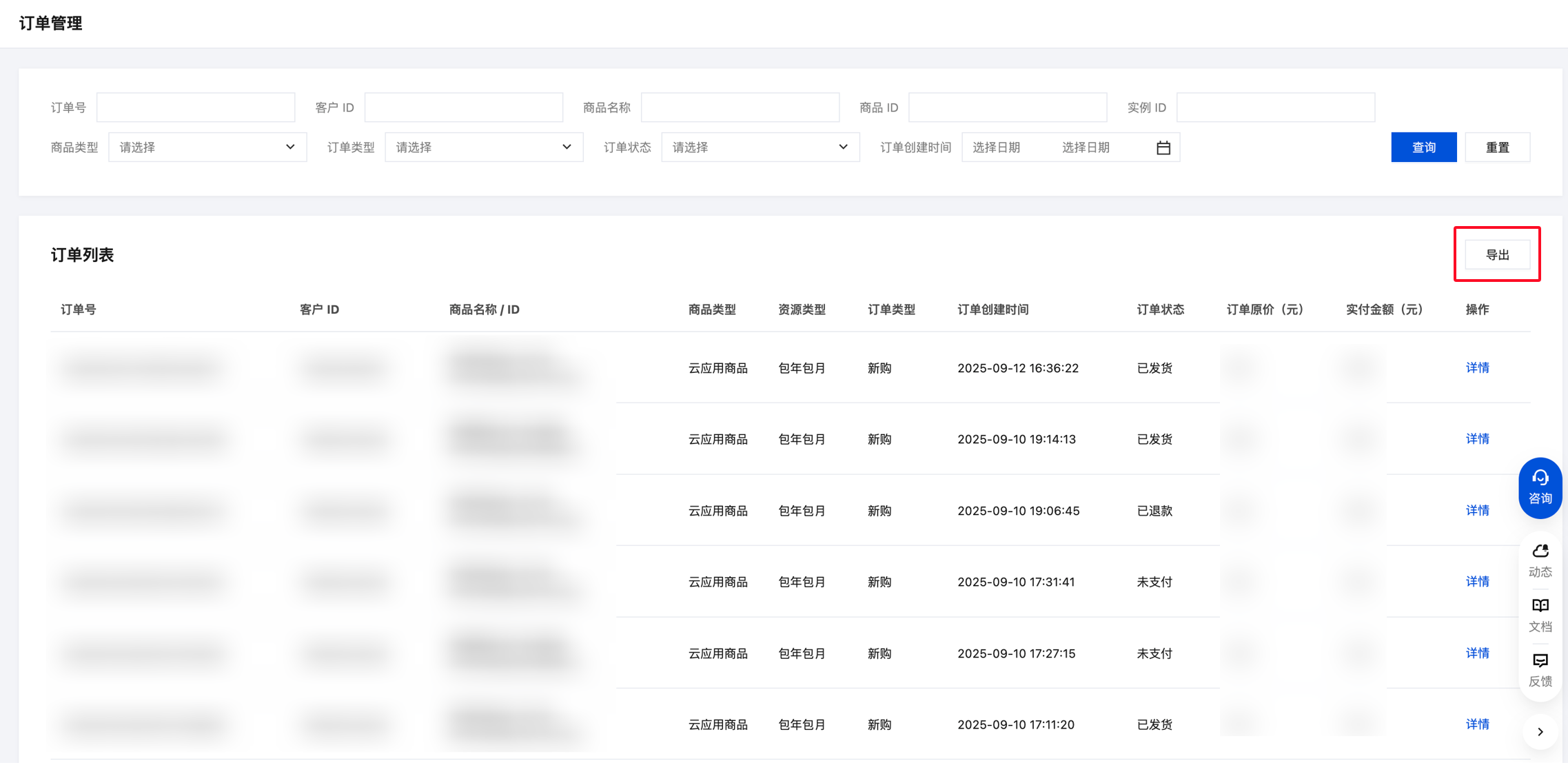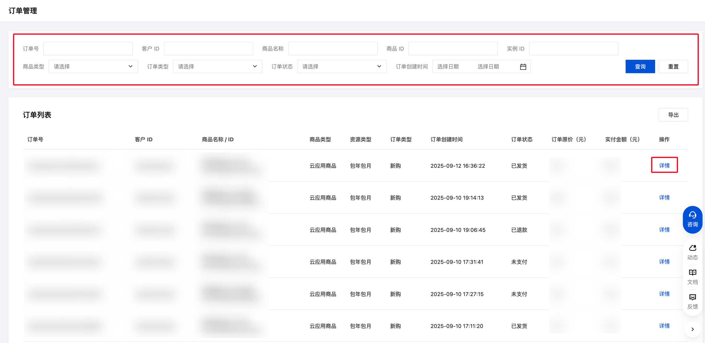 可使用订单号、客户 ID、商品 ID、实例 ID、商品类型、订单类型、订单状态、订单创建时间等筛选条件检索,查询订单。
