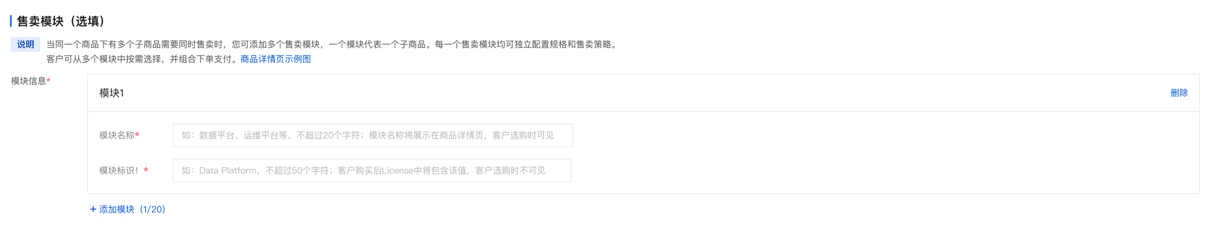 当一款商品下涉及多个子商品需要组合售卖时,可添加多个售卖模块。每一个模块代表一款子商品。