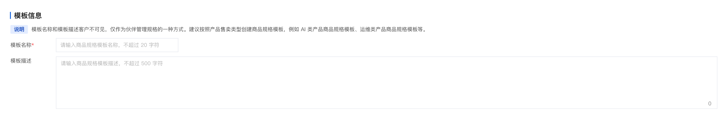 商品规格模板 | 是伙伴管理商品规格&售卖模块的复用性配置工具。其核心价值为: 规格标准化,作为管理规格的统一出口,简化商品上架流程。 规格可复用,支持多商品引用,减少规格重复配置工作。 规格灵活性,修改规格信息后可同步至所有商品,提升修改效率。 解决多售卖项自由选择、组合下单、合并支付、同时部署的复杂诉求。 模板内包含:规格、售卖模块 | - |