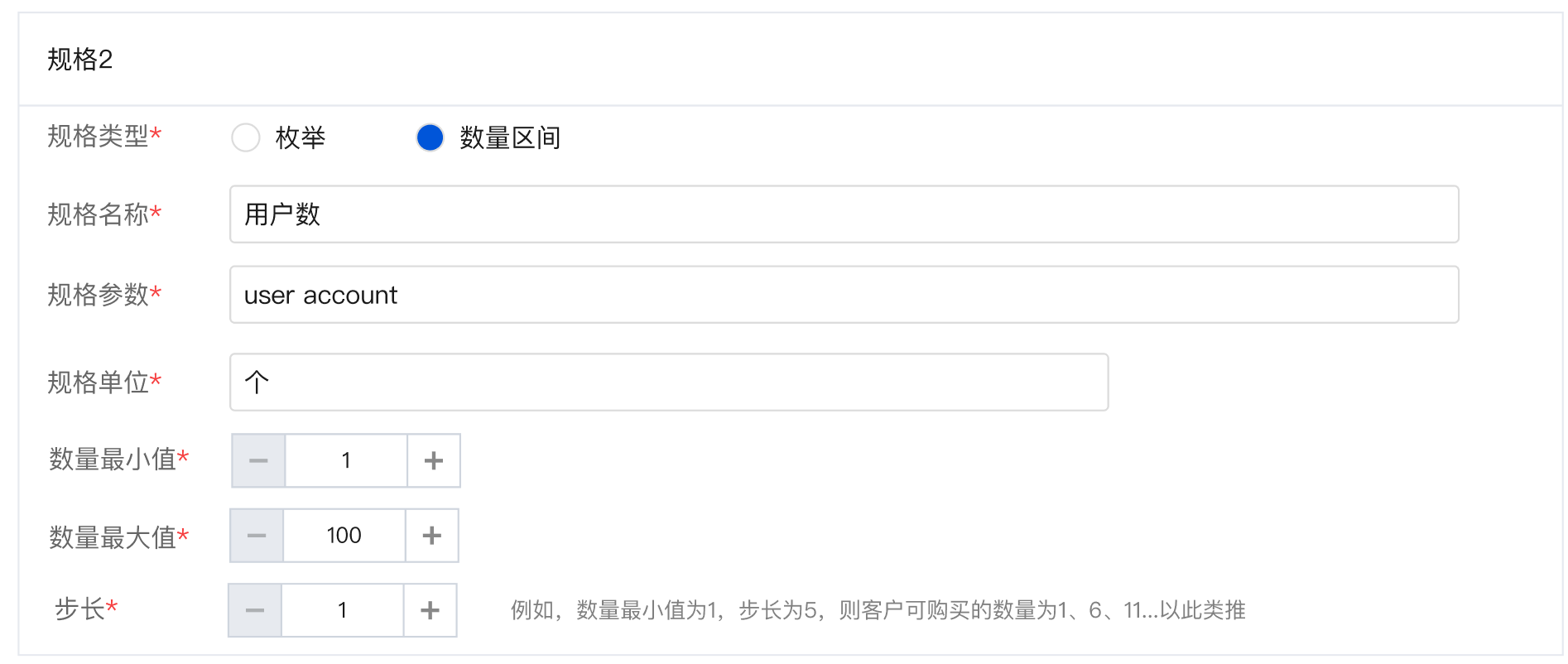 数值区间类 | 指范围比较大且无法一一枚举的规格,适用于无法量化的规格值。例如:用户数为1~100个等。 | ![]() 伙伴需要对应填写最小值、最大值和步长。支持输入1~999999范围内的整数。 步长指客户可购买的数量间距。例如:数量最小值为1,步长为5,则客户只能购买1、6、11等以此类推的数量。 | ![]() 客户可输入需要购买的数量 |