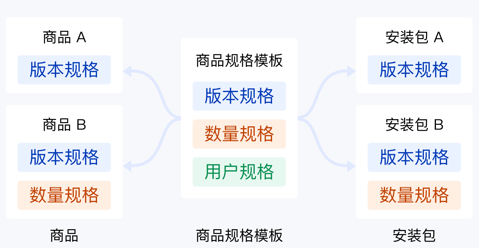 规格 | 用于细分商品的差异维度,是客户在商品详情页中“可选择的选项”,是连接商品和售卖项的“桥梁”,通过不同的规格组合,最终形成具体的可购买单元(即售卖项)。 规格需要与商品进行关联。 | 版本(标准版、高级版) 坐席数(100人、500人) |