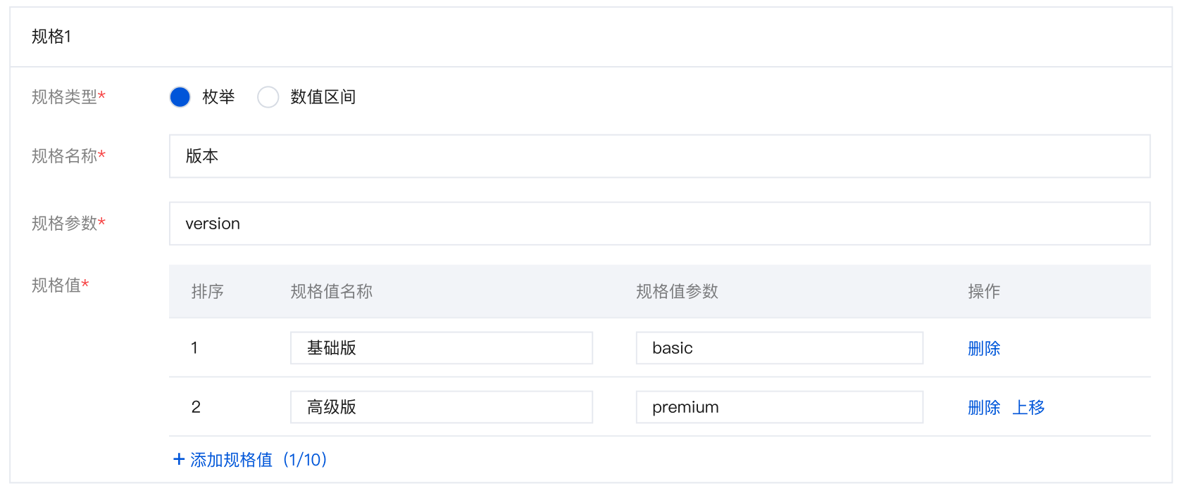 枚举类 | 指有限且可明确定义数量的规格,适用于只有少量的规格值。例如:商品版本为基础版、高级版、至尊版等。 | ![]() 例如:规格为“版本”,规格值为“基础版”、“高级版” | ![]() |