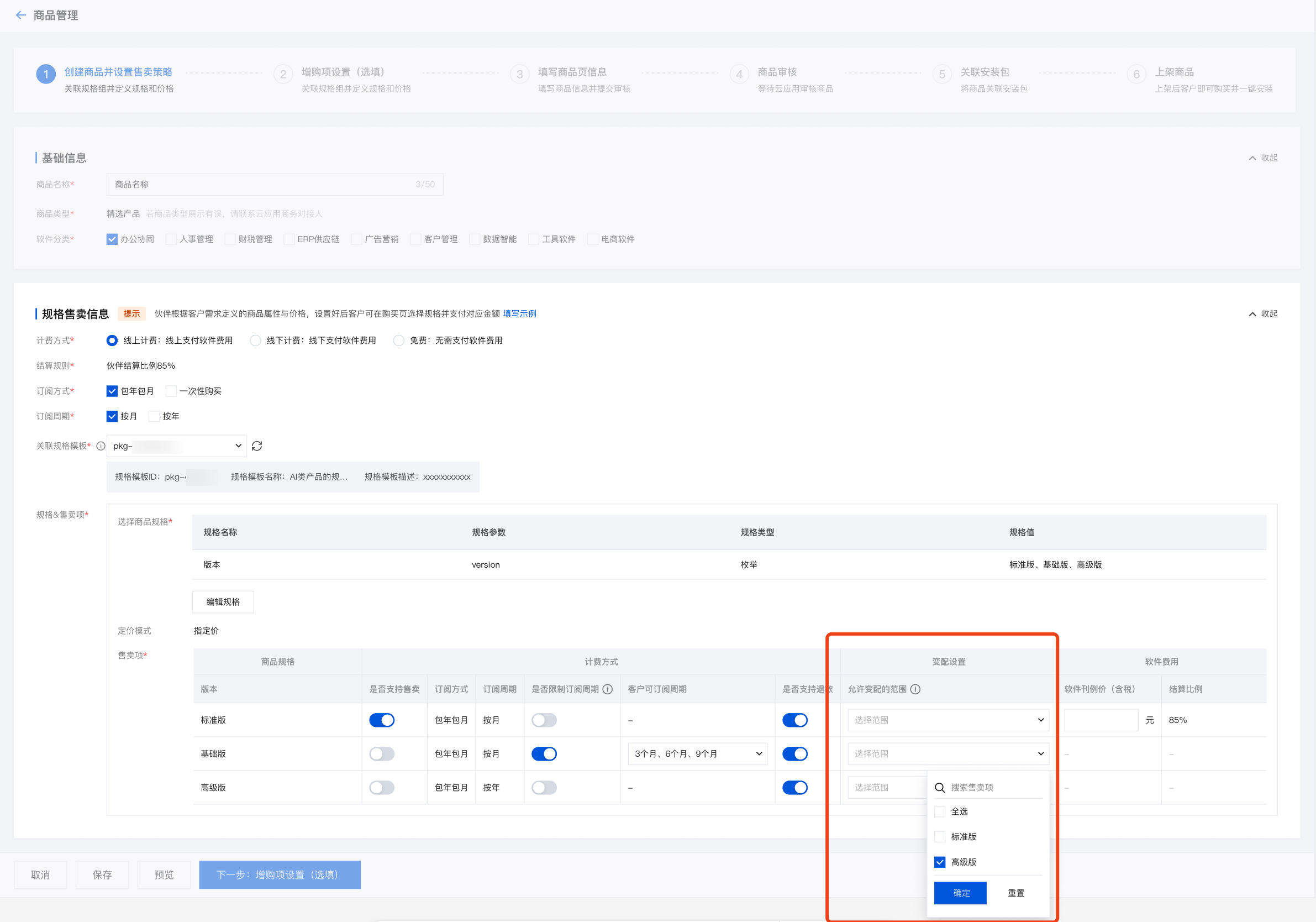 2. 在售卖项中选择可变配的范围。支持多选,若不选择代表该规格不允许变配。