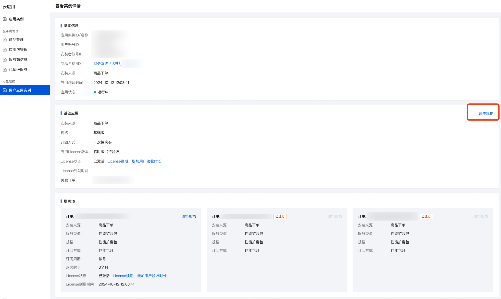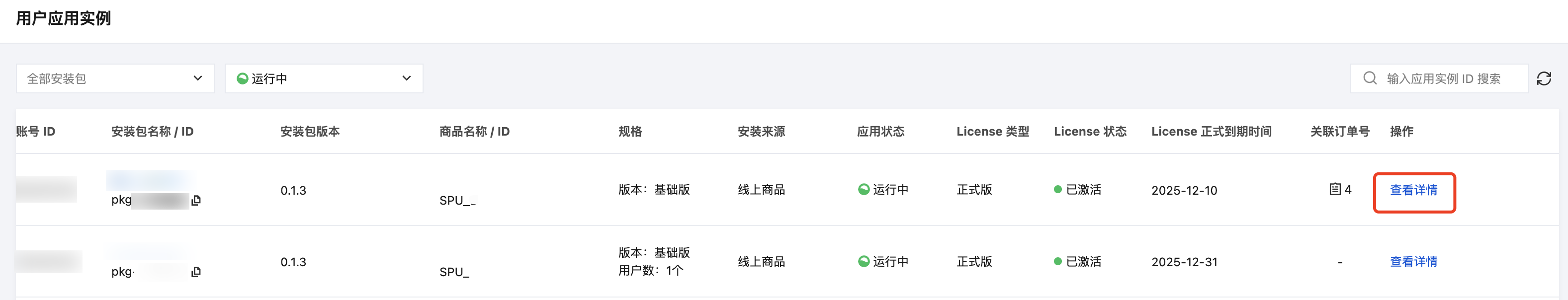 1. 伙伴进入 产品合作伙伴中心 > 应用管理 > 用户应用实例 菜单,找到需要变配的实例,单击操作列下的查看详情。
