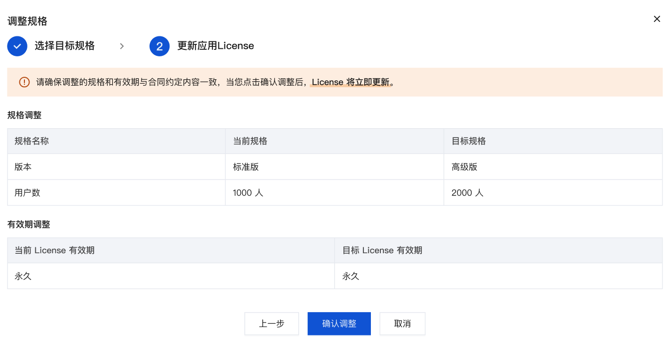 变配将生成一笔变配订单,但不会颁发新的 License,仅调整原 License 的规格信息。