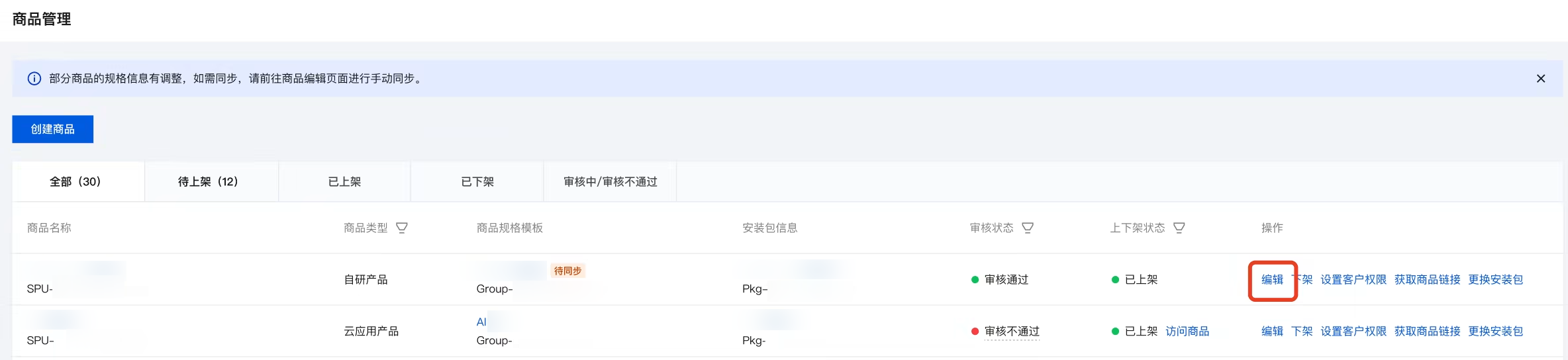 1. 伙伴进入 产品合作伙伴中心 > 应用管理 > 商品管理 菜单,找到需要变配的商品,单击操作列下的编辑。