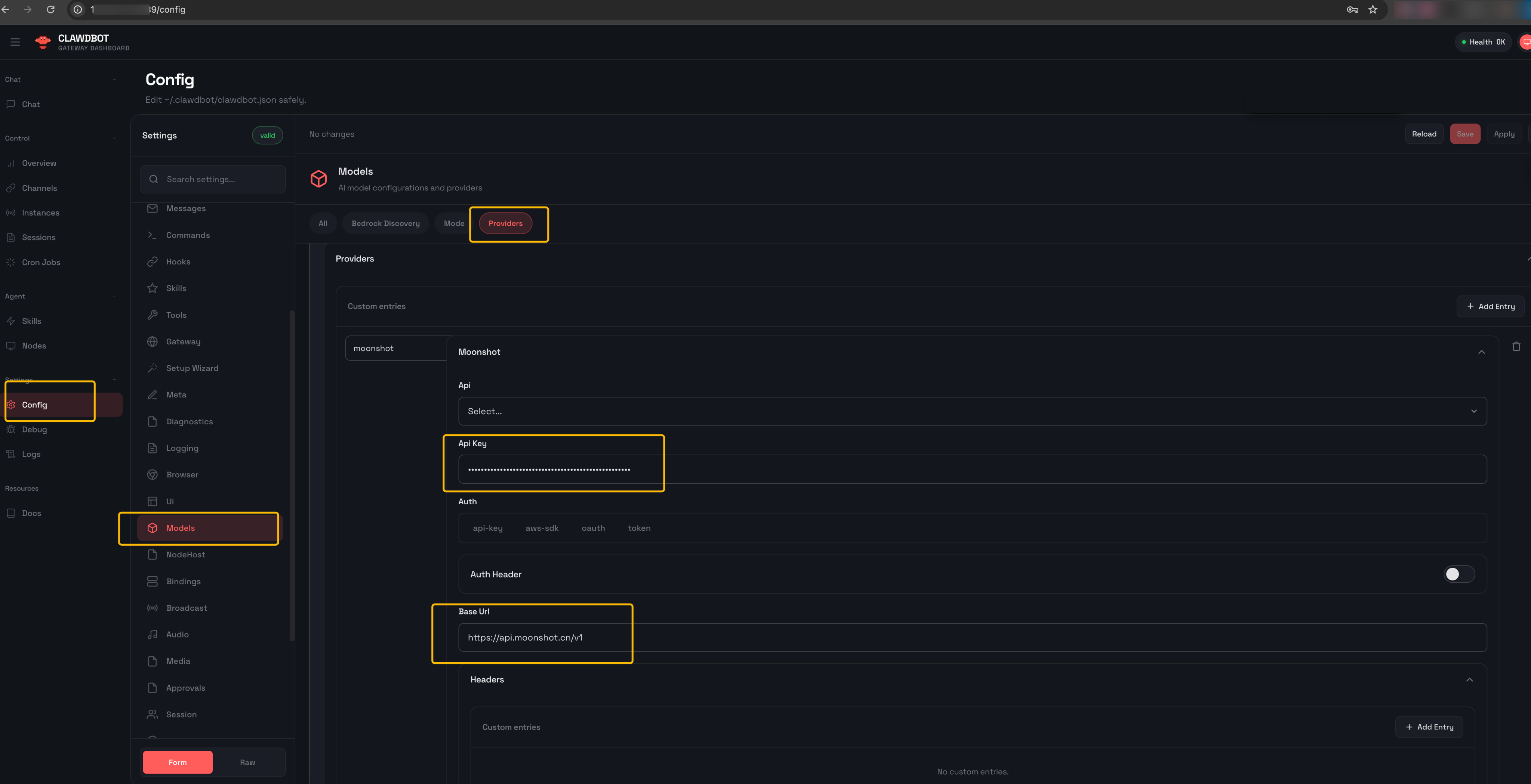 如果需要更换模型,可以直接在 Moltbot 的 Dashboard 进行操作。以 Kimi 模型为例,操作如下: