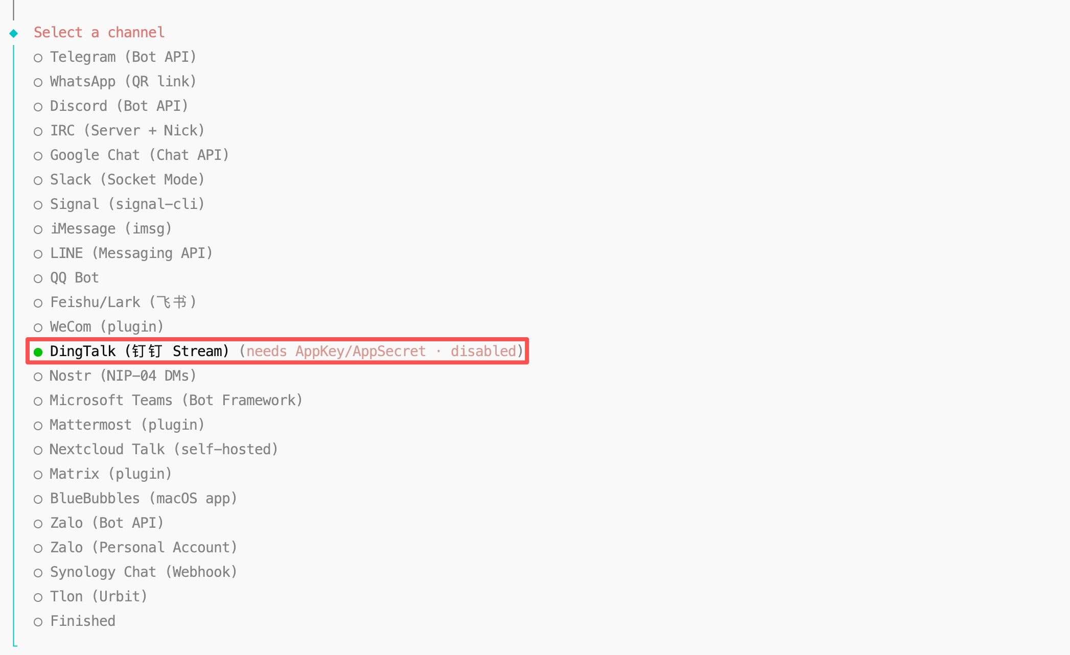 9.3.2 在选择通道步骤,选择 DingTalk(钉钉 Stream)。