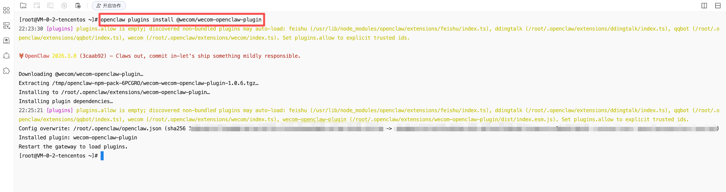 9.3.1 进入界面后,若首次添加通道,输入 openclaw plugins install @wecom/wecom-openclaw-plugin 命令行,安装通道插件。