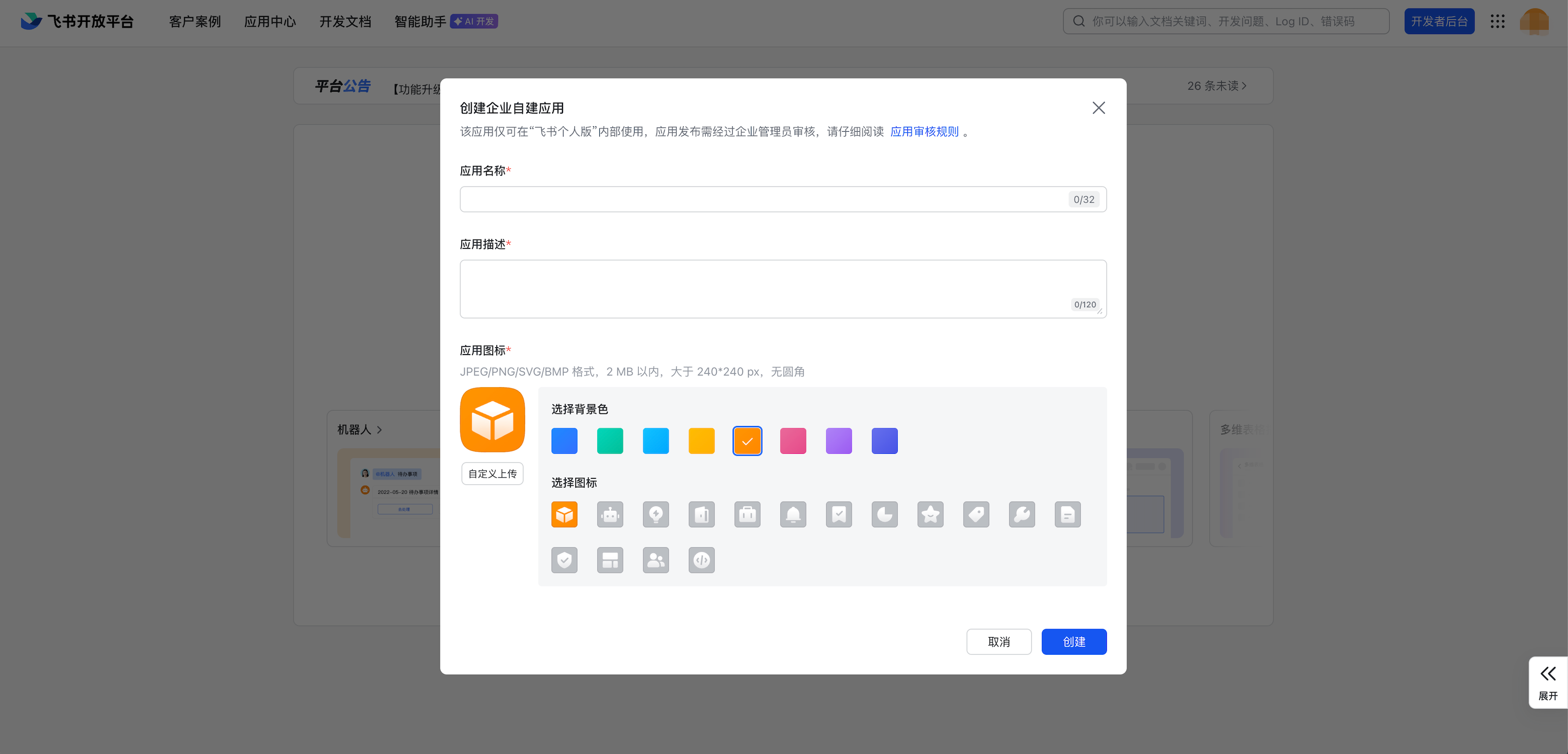 2. 进入开发者后台,选择创建企业自建应用。填写“应用名称”和“应用描述”完成创建。