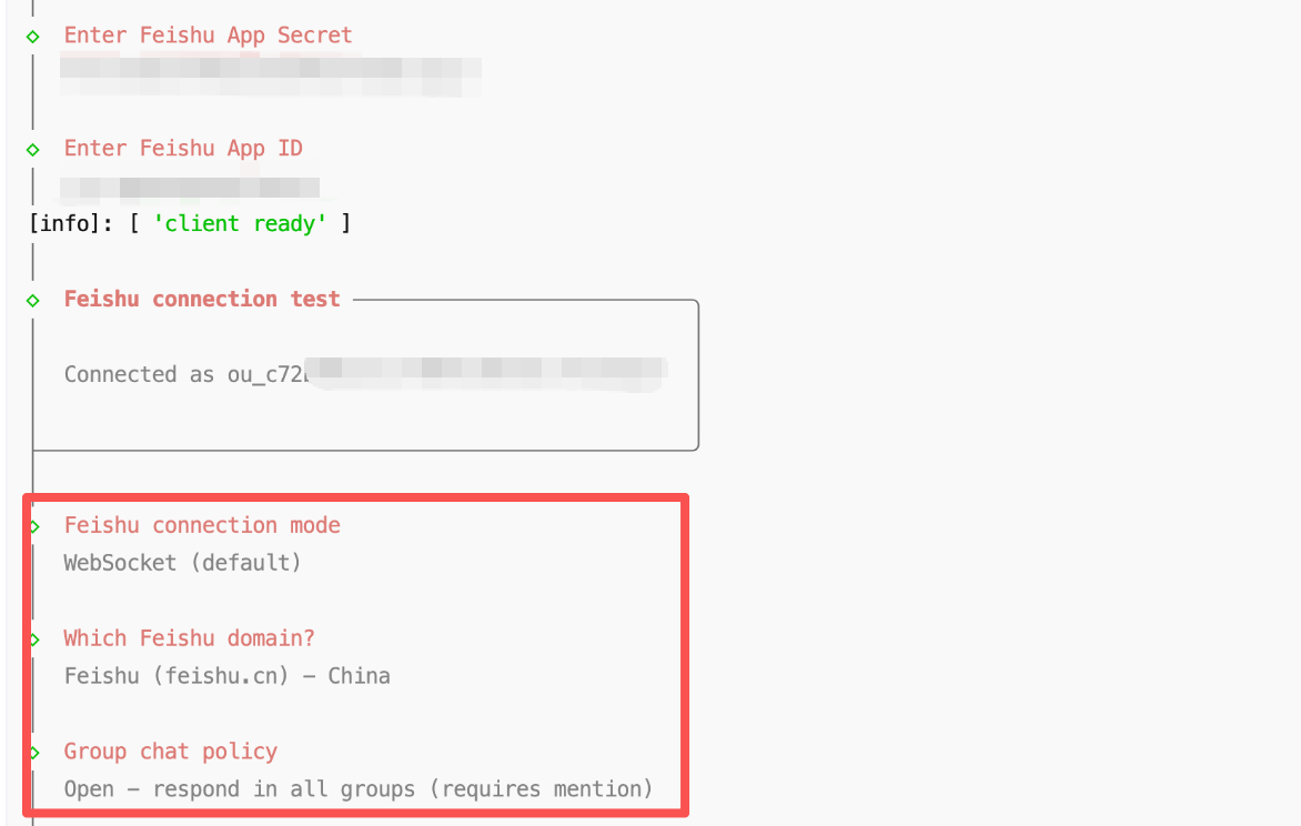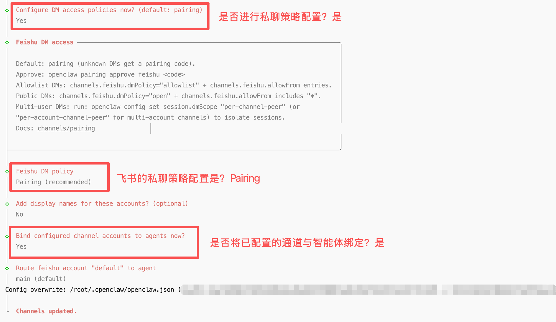 7.9 按照下方选项进行私聊 DM 访问策略配置,即可完成飞书通道配置。