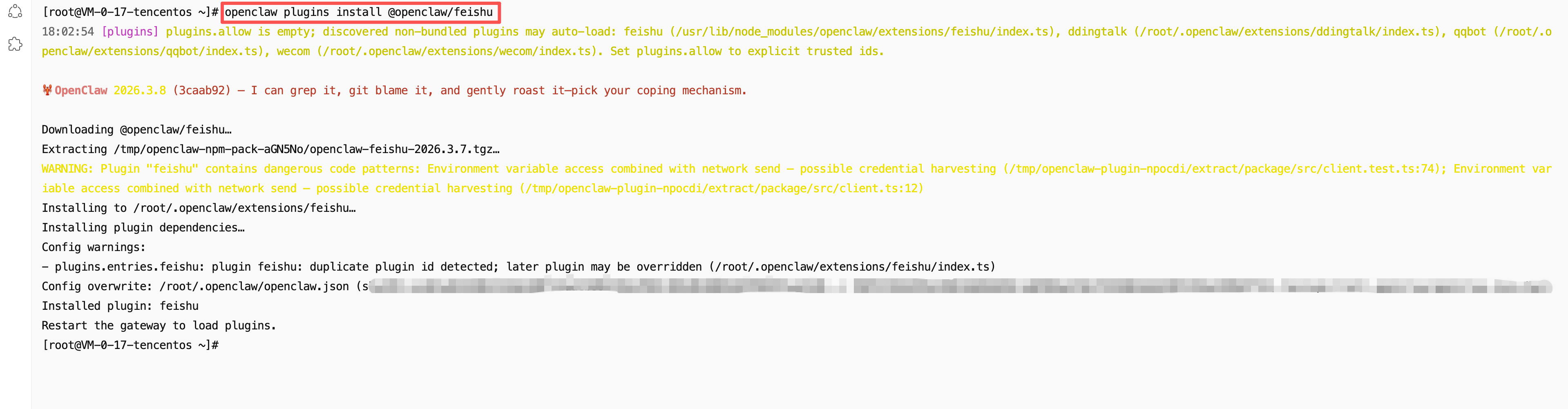 7.4 进入界面后,若首次添加通道,输入 openclaw plugins install @openclaw/feishu 命令行,安装通道插件。