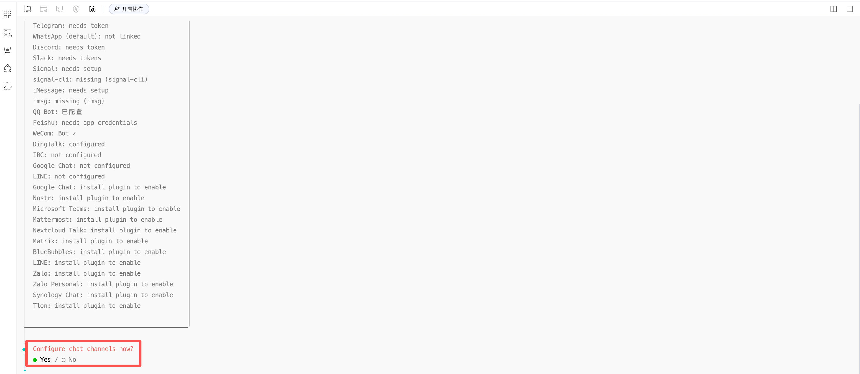 如您前序配置未成功,则可能无法保存订阅方式。请重新在云服务器内尝试通道配置或输入 openclaw gateway status 命令行,排查网关状态。