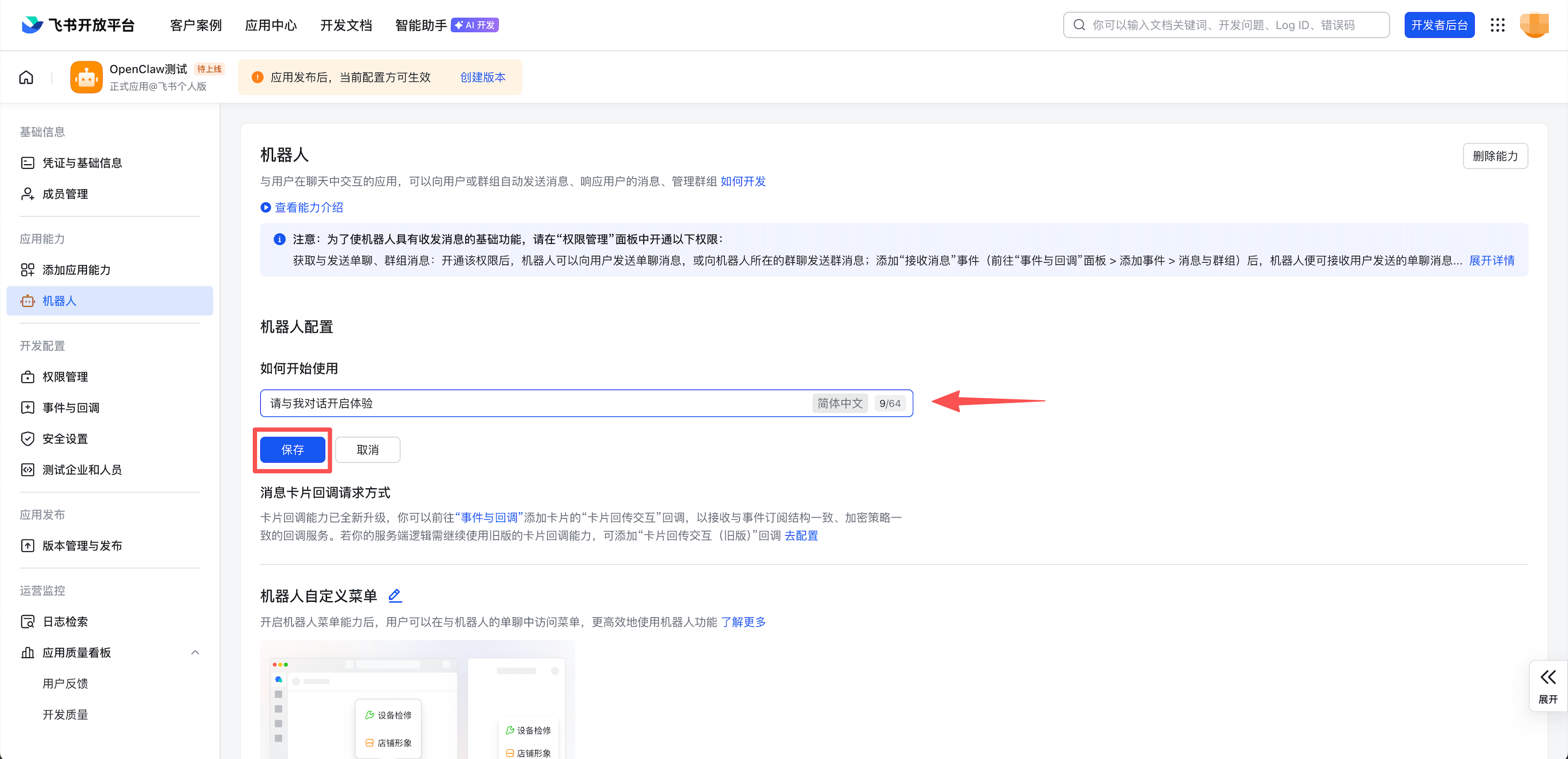 3. 进入应用,选择配置机器人。填写机器人配置信息,完成后单击保存。