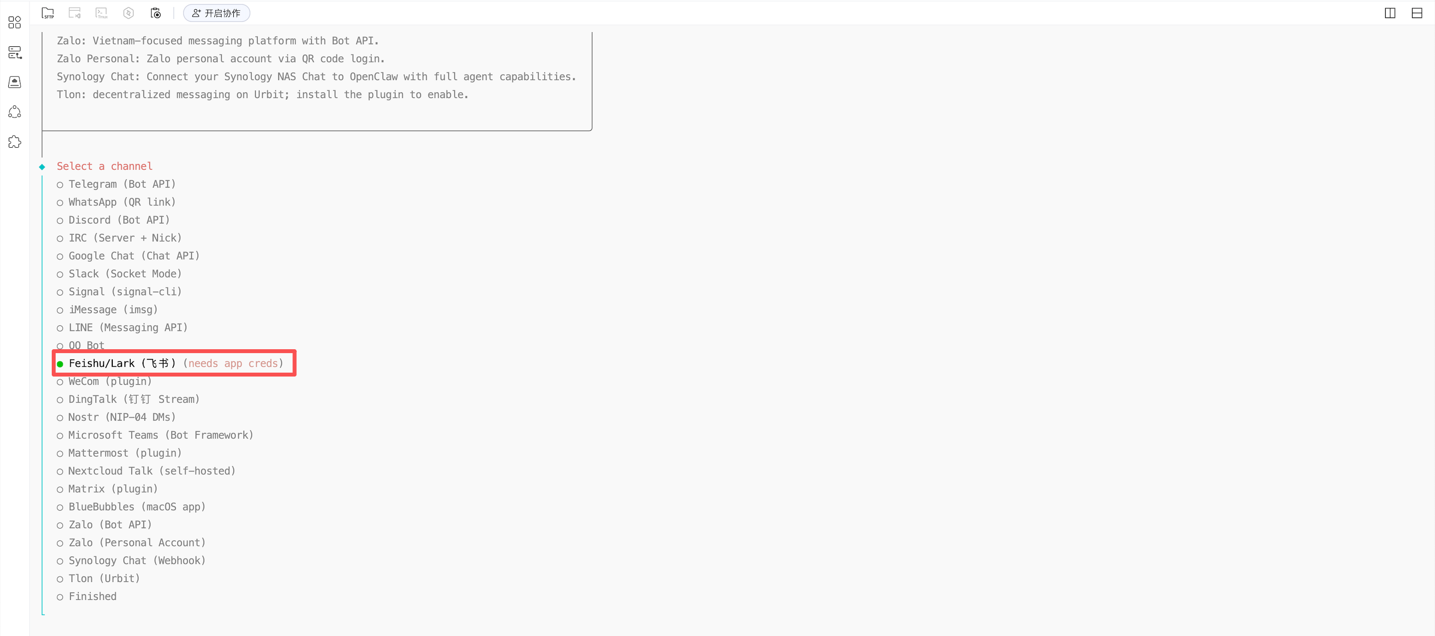 7.5 在选择通道步骤,选择 Feishu/Lark(飞书)。