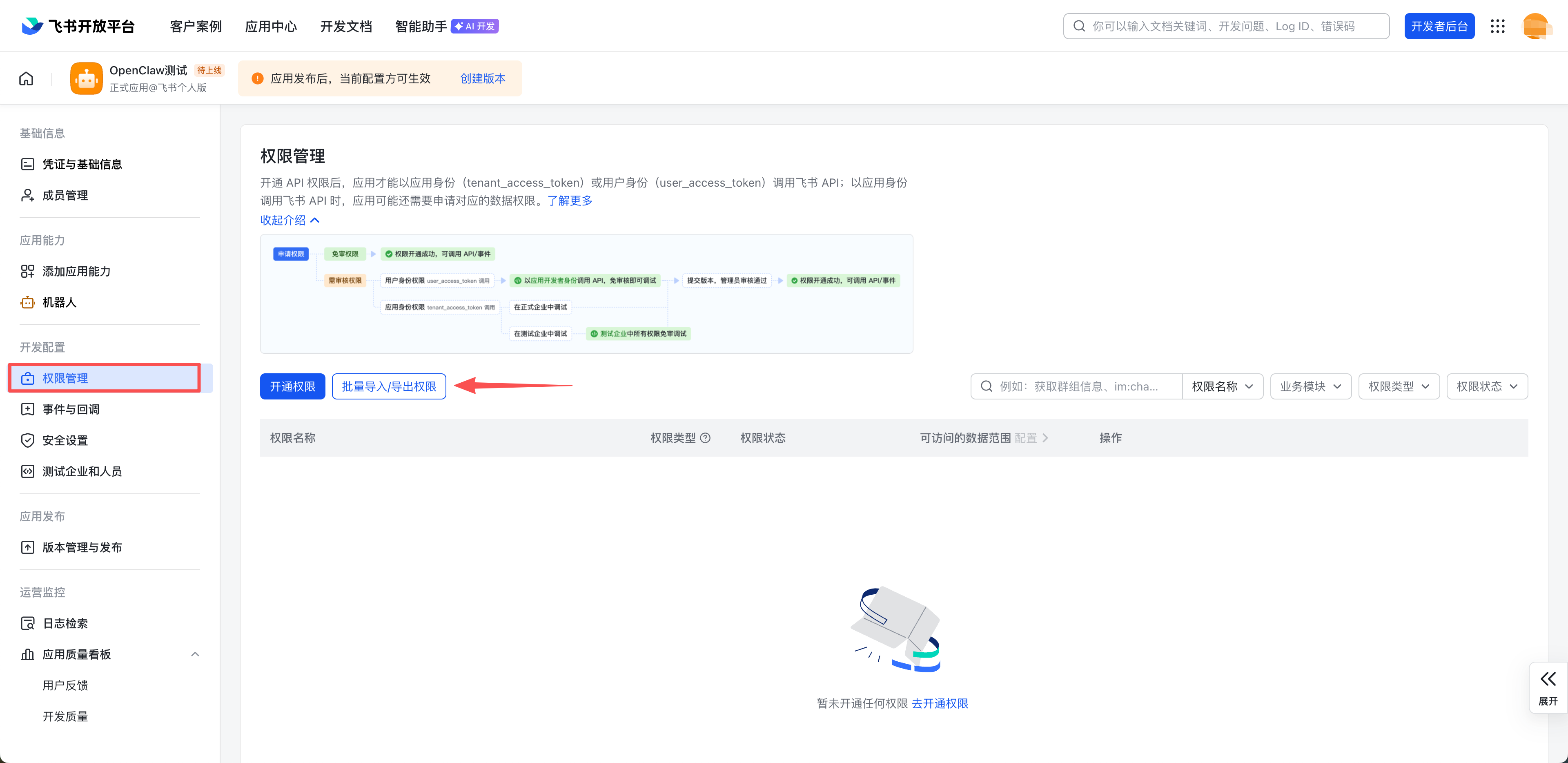 4. 在左侧菜单选择权限管理,单击批量导入权限。
