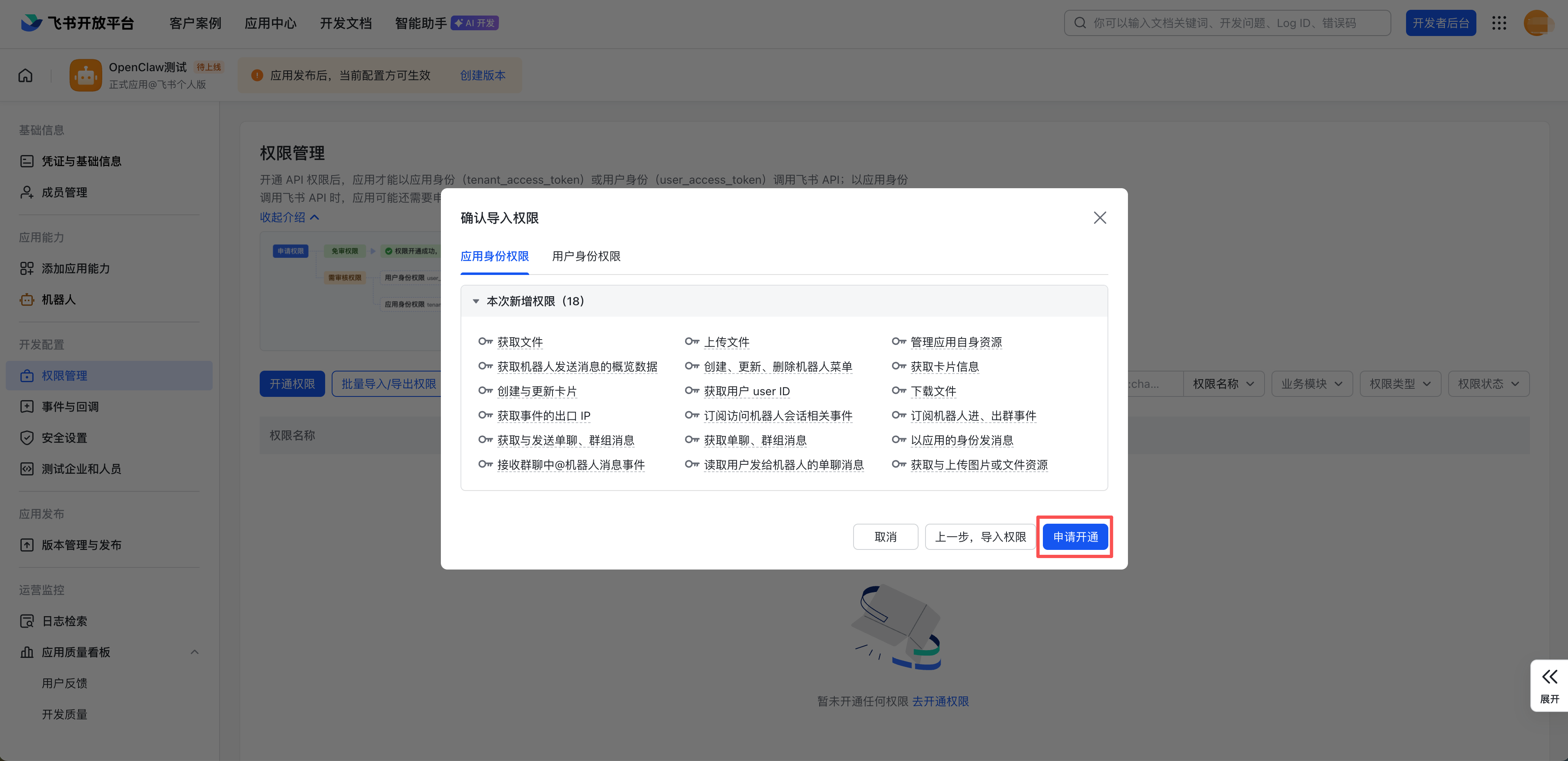 5. 复制下方代码,粘贴导入,单击确认新增权限,完成开通。