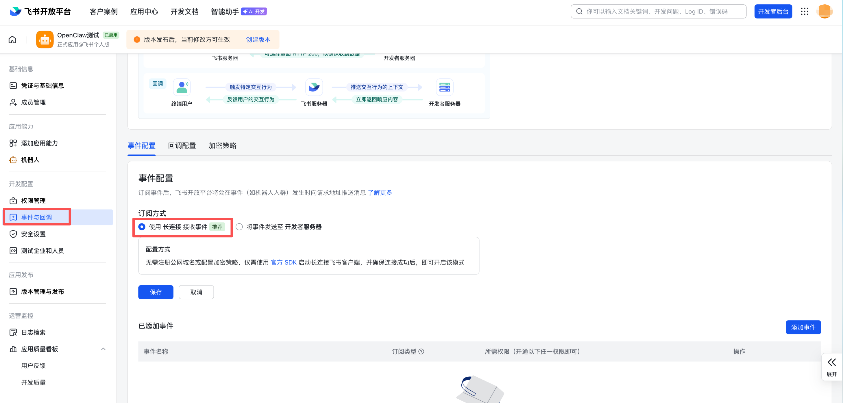 8. 返回飞书,在左侧菜单选择事件与回调,选择订阅方式为长链接,单击保存。