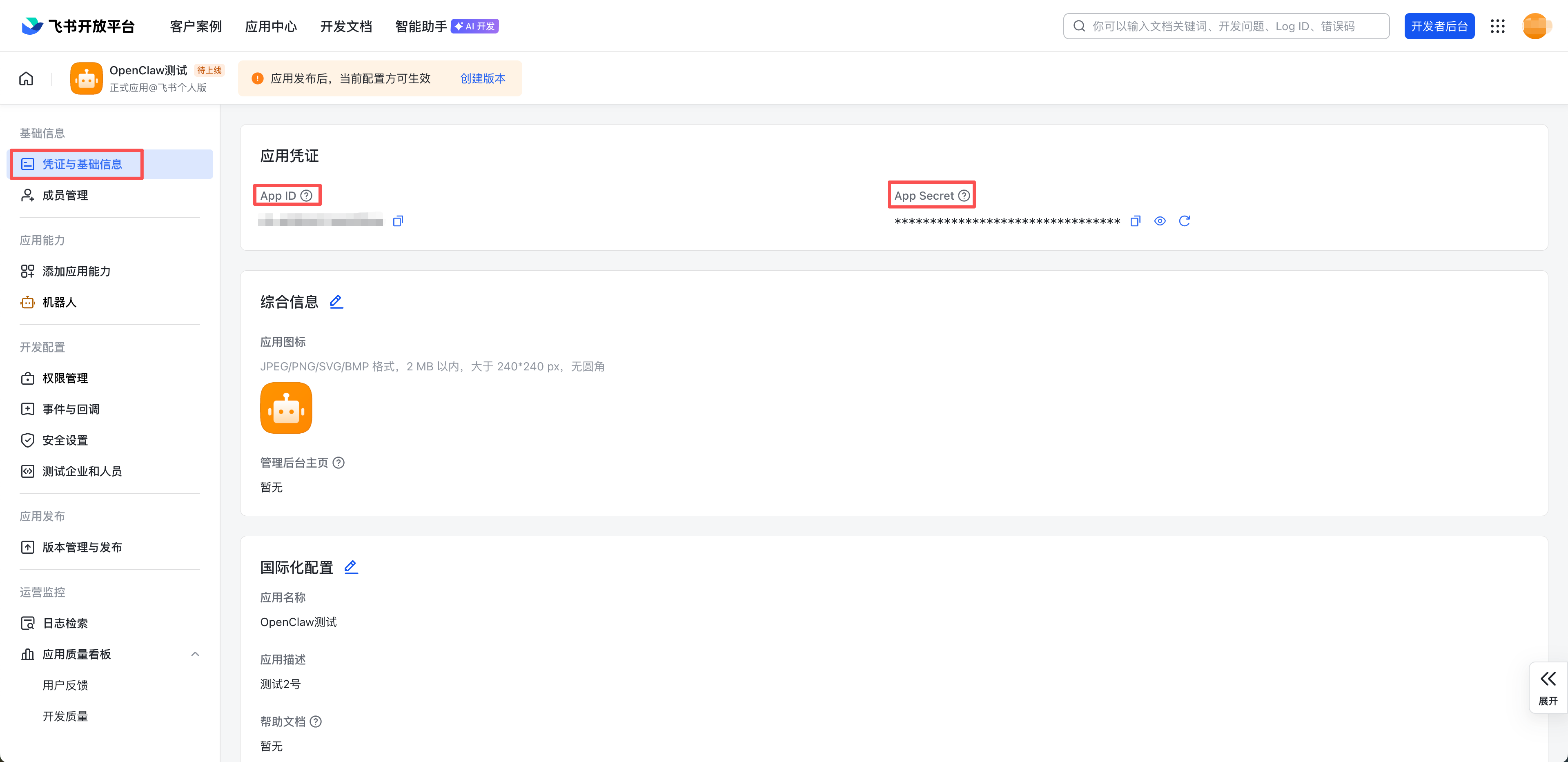 6. 在左侧菜单选择凭证与基础信息,获取 App ID 与 App Secret,后续步骤中将会使用。
