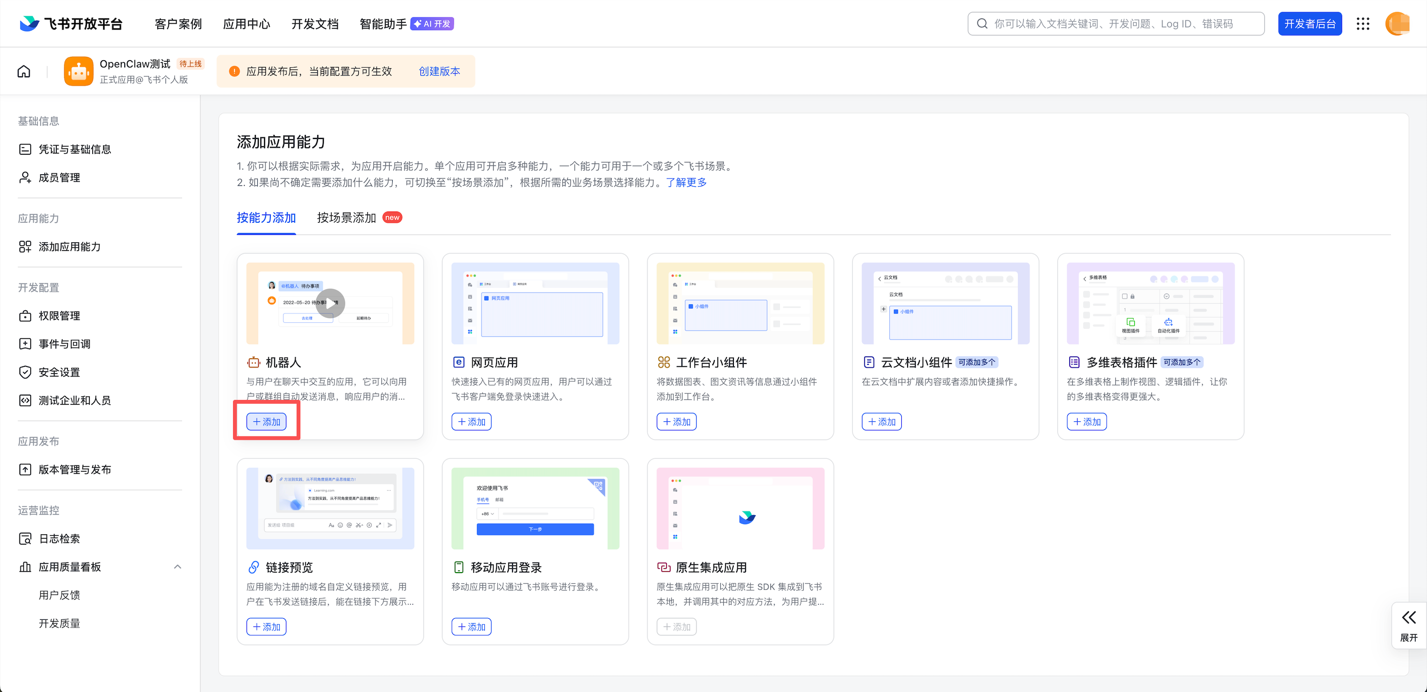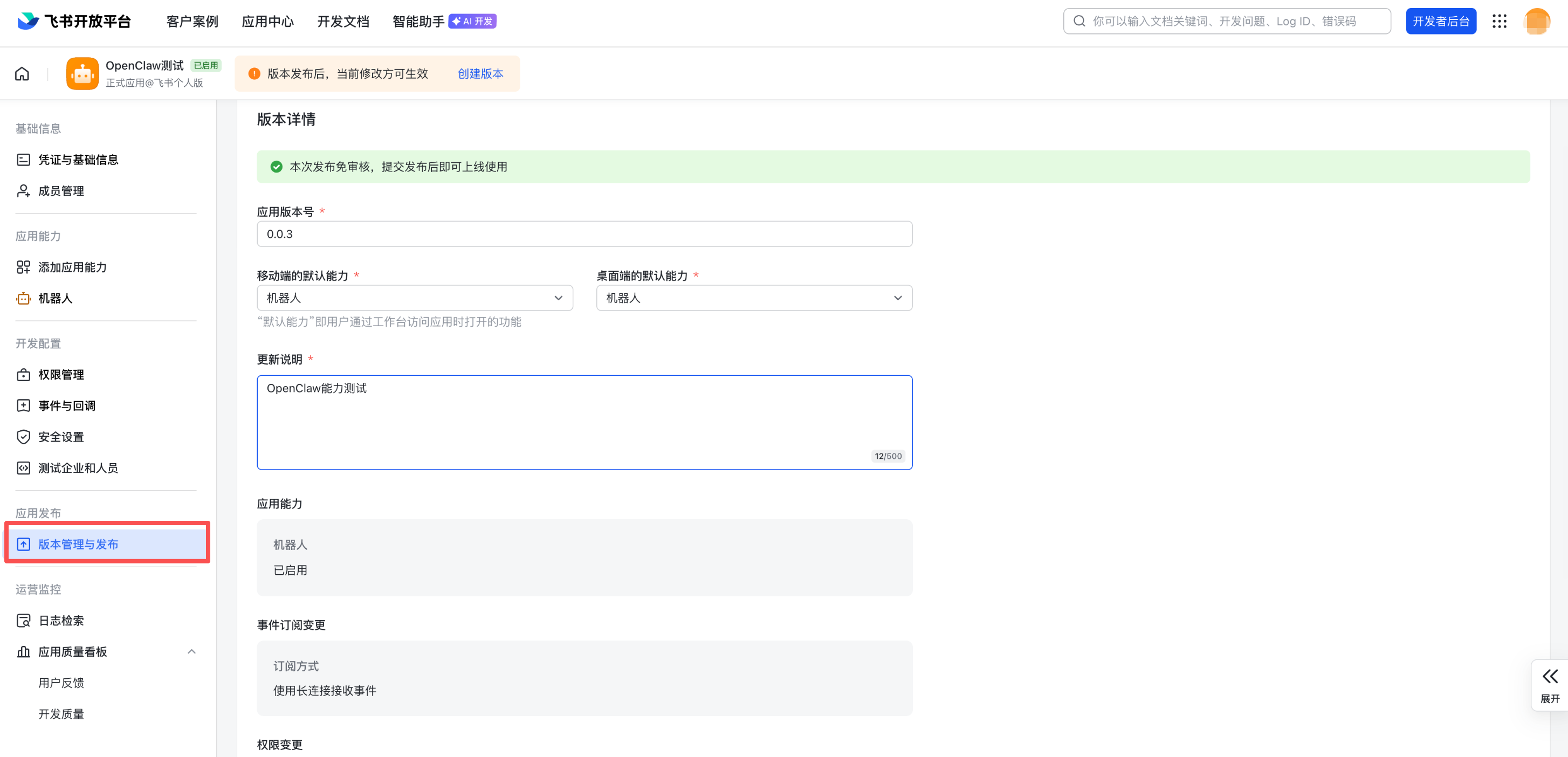 9. 在左侧菜单选择版本管理与发布,填写“版本号”“更新说明”“可用范围”等信息,单击保存即可提交发布。发布免审核,提交发布后即可上线使用。