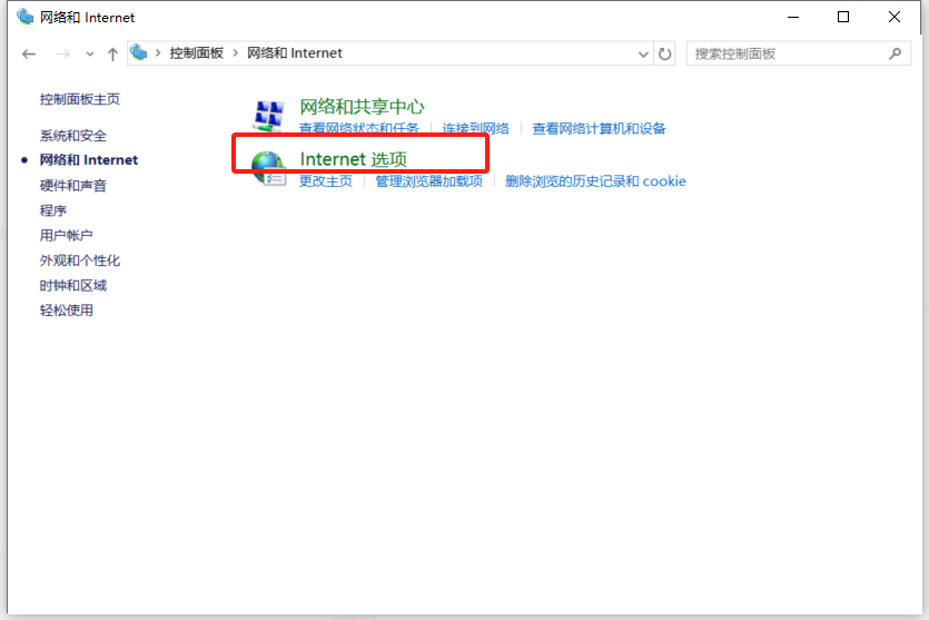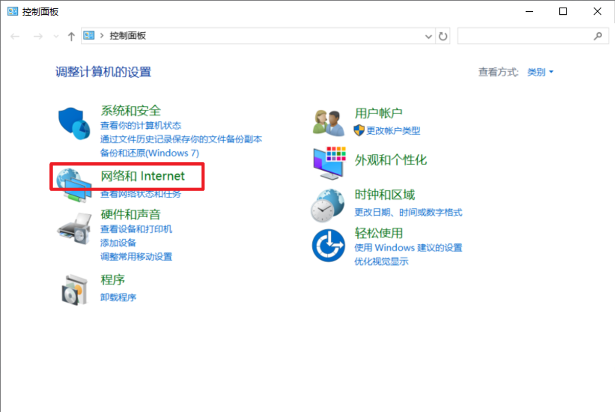 1. 打开您电脑的控制面板,单击网络和 Internet。