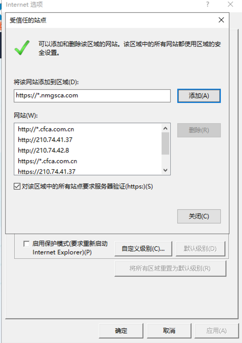 解决方法:将内蒙古网信电子认证有限责任公司官网地址添加到信任站点,如下图所示: