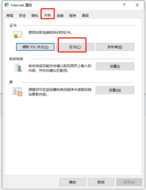 3. 在 Internet 属性中选择内容 > 证书,查看证书信息。