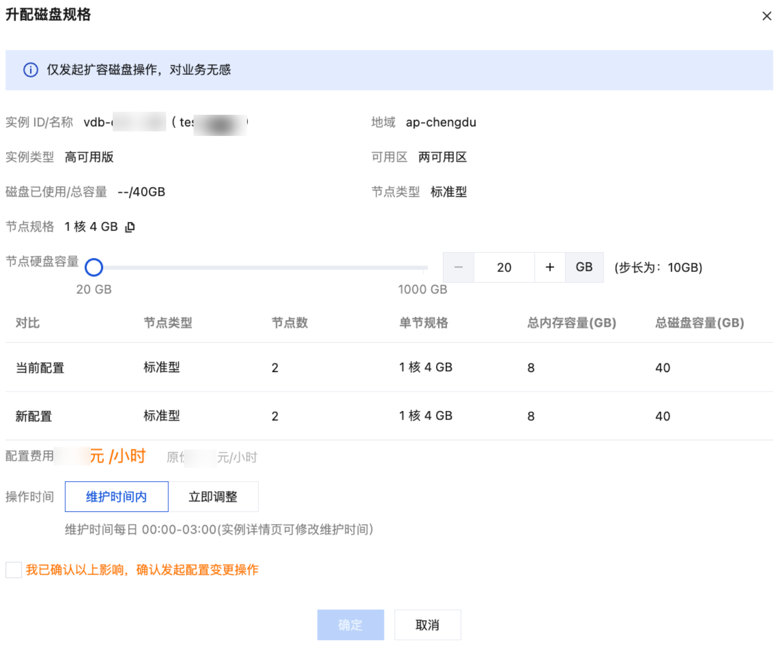 实例 ID/名称 | 确认升级磁盘实例信息。 |