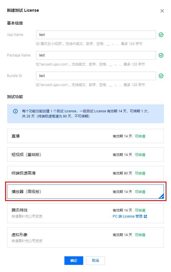 若您想在已创建的测试应用中申请测试播放器功能,则需选择您想测试的应用,单击测试新功能。