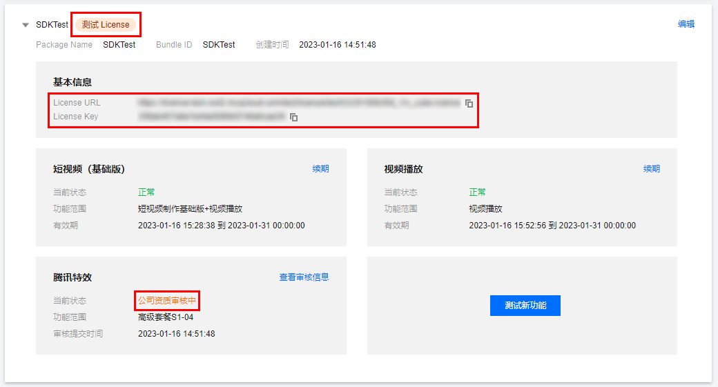 2. 测试版 License 成功创建后,页面会显示生成的 License 信息。此时 Key 和 LicenseURL 两个参数暂未生效,等待提交审核通过后方可生效使用。在 SDK 初始化配置时需要传入 License URL 和 License Key 两个参数,请妥善保存以下信息。