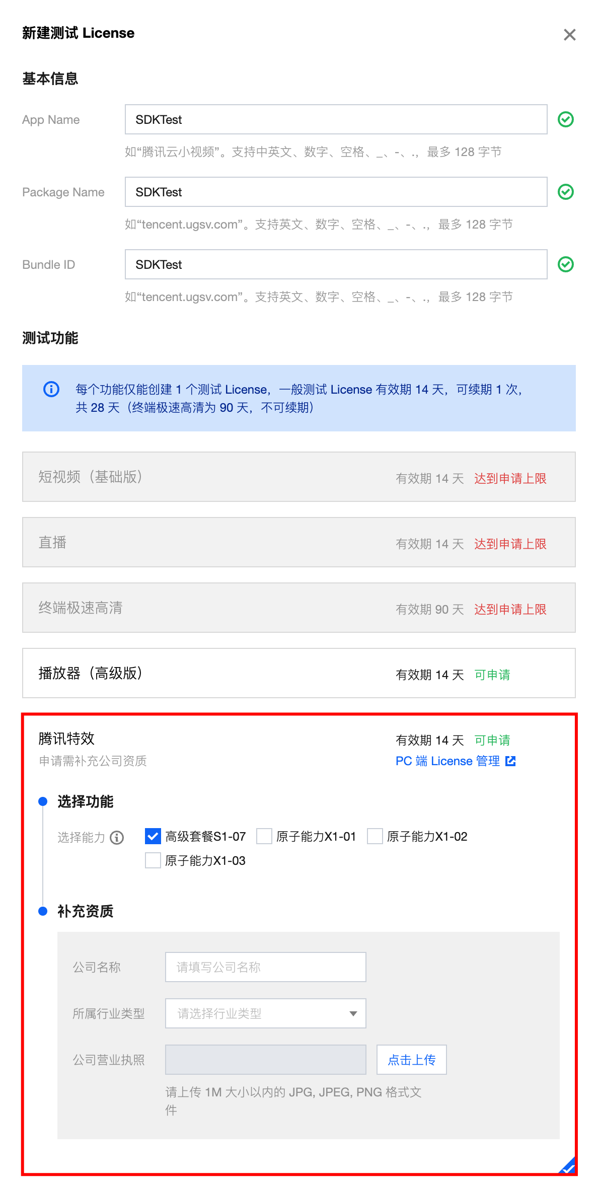 ,选择腾讯特效,选择所需测试的能力:高级套餐 S1-07、原子能力 X1-01、原子能力 X1-02、原子能力 X1-03,并补充资质,准确填写公司名称、所属行业类型,上传公司营业执照,单击确定提交审核申请,等待人工审核流程。
