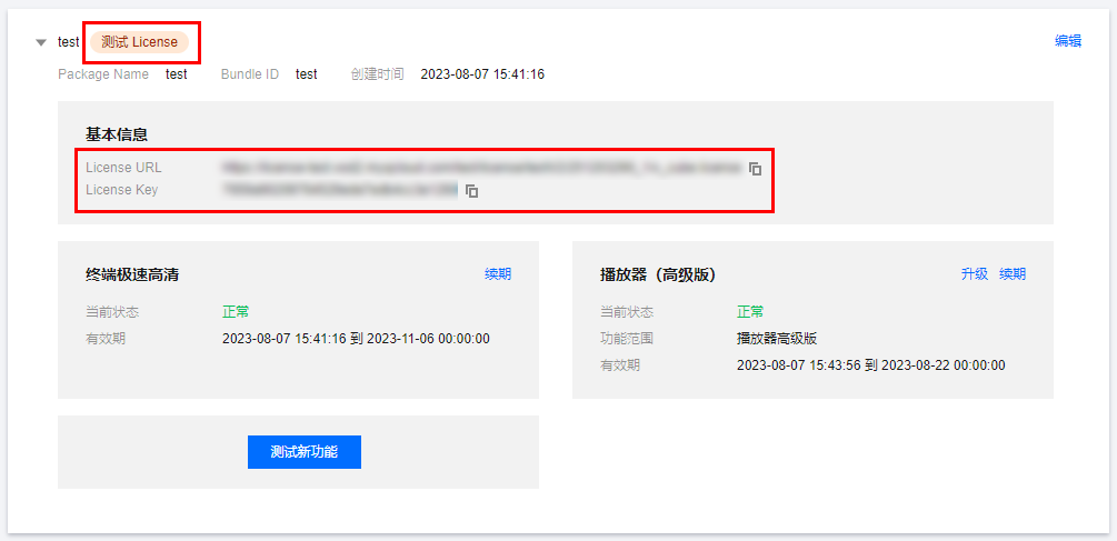3. 测试版 License 成功创建后,页面会显示已生成的 License 信息。在 SDK 初始化配置时需要传入 License Key 和 License URL 两个参数,请妥善保存以下信息。