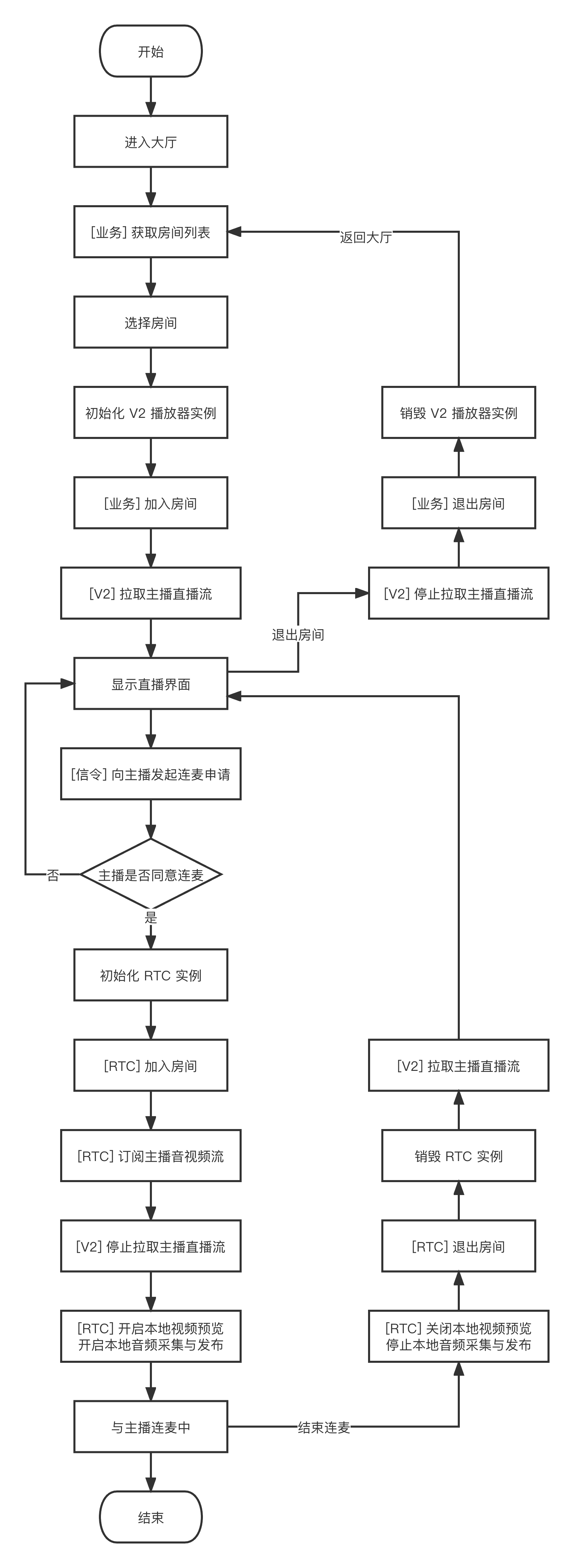 下图展示了 RTC 实时互动直播间观众进入房间、申请连麦、结束连麦、退出房间的流程。