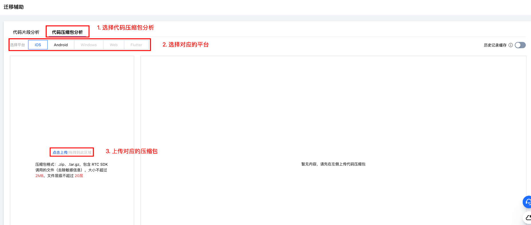 1. 进入迁移辅助 > 代码压缩包分析。