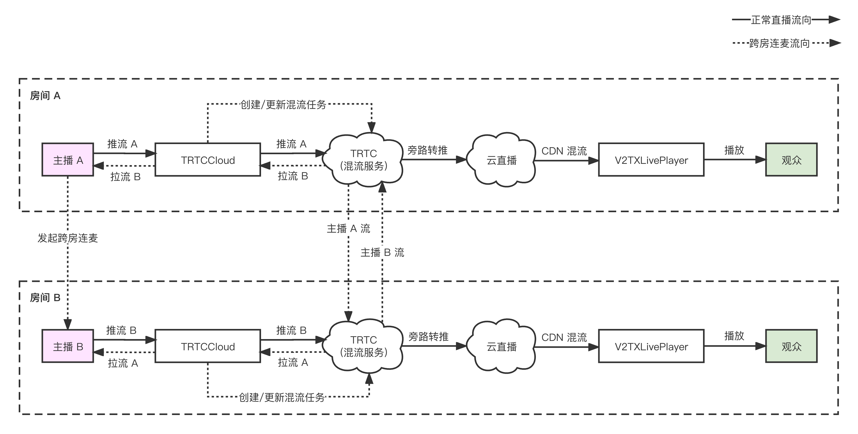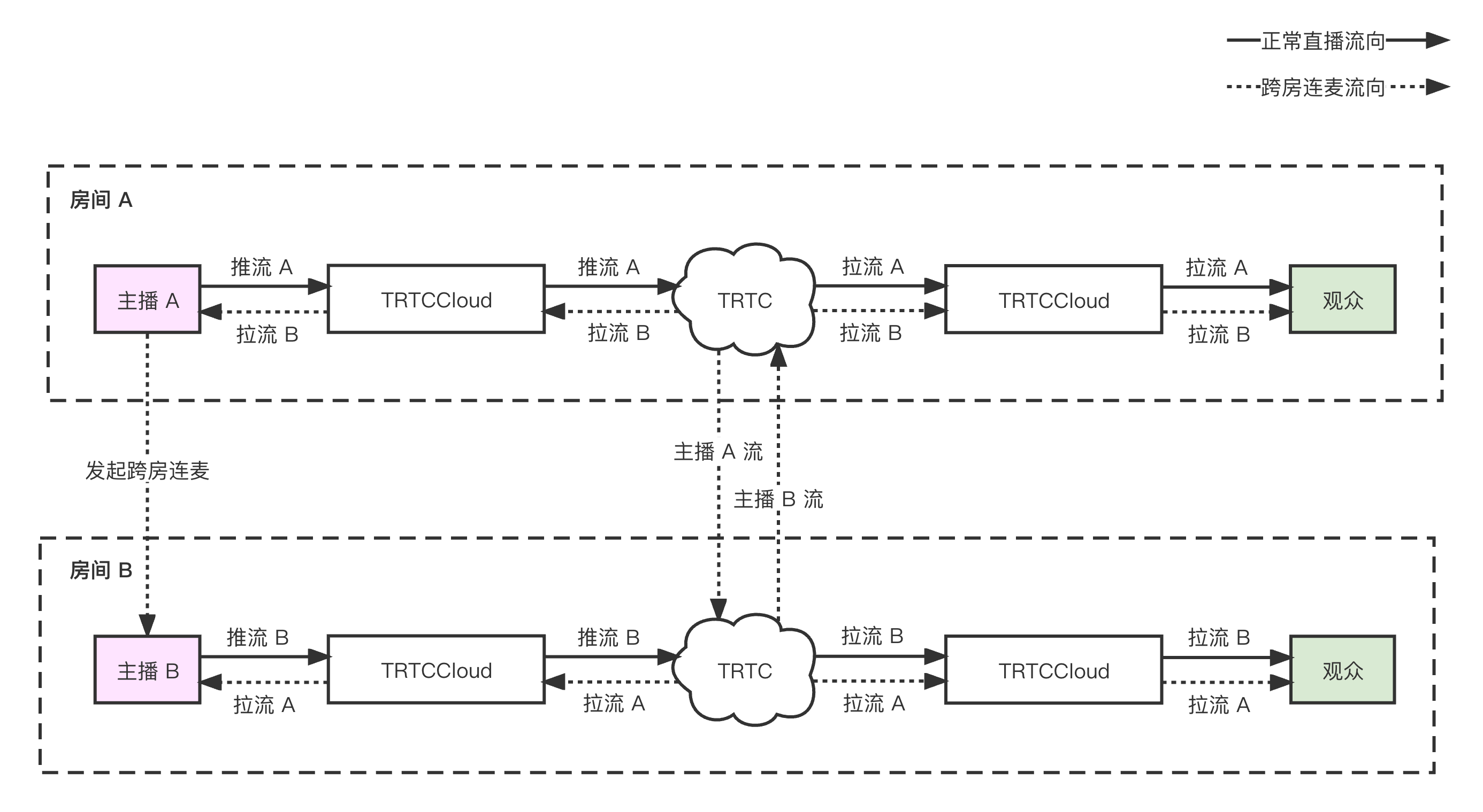 默认情况下,只有同一个房间内的用户之间音视频可以互通,不同的房间之间的音视频流是相互隔离的。通过跨房连麦,可以将另一个房间中某个主播音视频流发布到自己所在的房间中,与此同时也会将自己的音视频流发布到目标主播的房间中。让身处两个不同房间中的主播进行跨房间的音视频流分享,从而让每个房间中的观众都能观看到这两个主播的音视频。